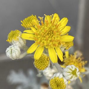シロタエギク シルバーリーフに 黄色の小花 蕊も元気にお空を仰ぎ 雪の結晶見つけました ❄︎ . ° ❄︎ キク科 別名 ダスティミラー 葉: フェルト状の白い毛が密生し、銀白色に見える。品種によって葉の切れ込みの深さや形が異なる。