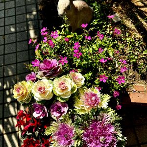 こんにちは➿💕 暖かくなってきました☀️ 横浜18℃予報今15℃ 穏やかな日曜日 お花達も嬉しそうです🌸🌞 ①シクラメンとハボタンの寄植えとシレネピンクパンサー ②③④ハーデンベルギア白🤍紫💜 ⑤ビオラとアリッサム寄植え