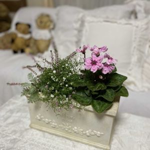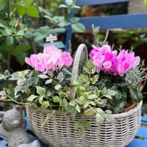 ꕤシクラメンの寄せ植え② ガーデンシクラメン『クレヨン』 ピンクの濃淡でグラデーションを付け、カルーナもピンクのお花で明るめの葉色をチョイス。 左奥にはサプライズにピンクのムスカリを忍ばせています🩷🩷 リーフは割いたのものを少しずつ… 母へのプレゼント用に軽めの🧺バスケットにしてみました🎶 🌿カロケファルス・ウインジー 🌿アイビー・ホワイトワンダー 🌿セリフラミンゴ