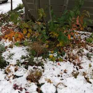 雪が積もって、まだ紅葉しきれてないジューンベリーのシュートたち…。 あえて剪定しないで親子?のようにしています。