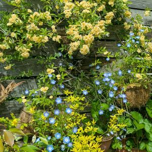 おはようございます😊 ほぼ満開のモッコウバラとネモフィラとプリムローズジャスミン 一年の中で庭が一番華やかになっています🌸