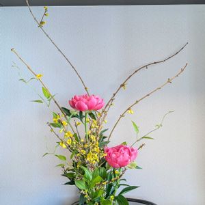 昨日のお稽古 芍薬が開いて重心が上がったので 少し切りました レンギョウが暴れた枝で 仲間みなて苦労しました😅