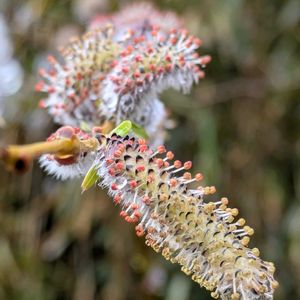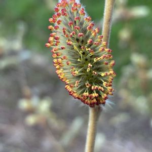 イヌコリヤナギ 雨の日、買い物に行く道を変えて車を走らせると、小さな流れのそばにネコヤナギに出会う♬ 黄色い花粉を出す前の葯は紅く4つ見えているが、これは2本の花糸が合着しているのだという🔴苞の先が黒く、基部には毛があって、紅い葯をいっそう引き立てているようだ🖤 雄しべがまだ伸びていない蕾はほわほわとして、展開前の新葉が花序の基部に付いている💚 枝はよく上に伸びて、茂みを作っていた木曜モフモフ🏷
