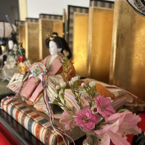 おはようございます😃 今年も無事にお雛様を飾ることができました。1人で出し入れするので、大変ですが、出せばやはりいいなあとしばし見惚れてしまいます。 1、小さな花を手前に置いて…主役はお雛様にしましょう。 花器: ヨーロッパのどこか製ガラスの一輪挿し 花材: ラークスパー、ワックスフラワー、アルストロメリア 2、お雛様が、幸せそうに微笑んでいます 3、7段飾りはやはり場所を大きく取りますね😅 4、弥生ちゃんとアンジェラちゃん娘の人形の代表として2体飾りましょう 5、カレンダーも3月に変えました。今年は曜日がズレていますが、この版画の図柄が好きなので👍🌸