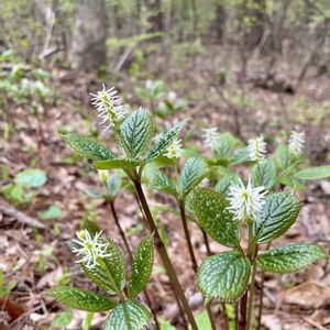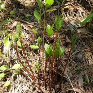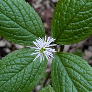 ヒトリシズカ(一人静) センリョウ科 チャラン属 4~5月 20~50cm 在来種 横に這う短い地下茎から、数本~多数の茎が直立し、はじめ赤紫色を帯びるが後に緑色になる 茎の下部3~4節に膜質の鱗片葉がある 上部には2対の葉が十字対生するが、節間がごく短いため、4個の葉が輪生しているように見える 葉は光沢のある濃緑色で、長さ6~10cmの楕円形〜卵状楕円形、先は短く急にとがり、縁には鋭い鋸歯がある 葉がのびきる前に葉の中心から白い花穂を1個(まれに2個)のばす 花には花弁も萼もなく、雌しべ1個と子房の横腹に雄しべ3個がつく