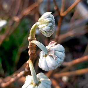 ミツマタ ジンチョウゲ科ミツマタ属 落葉低木 中国中南部、ヒマラヤ地方原産 花期3〜5月 三つ叉に分かれた枝の先に黄色い花を咲かせる。 葉が出る前に、花が球状に集まった黄色の頭花を、枝先に付けて下向きに咲かせ、甘い芳香を放つ。 開花はまだ先のようですが、蕾の状態でも白い花が咲いているように見えました。 1年枝の樹皮は和紙や紙幣の原料として用いられている。