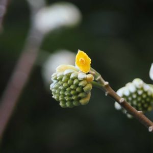 『強靭』『肉親の絆』。「強靭」は、上質な和紙や紙幣の原料になる強い繊維質の樹皮に由来します。「肉親の絆」は、三つに分かれた枝が、父・母・子を連想させることにちなみます。小花が寄り添ってくす玉のように見える、香りも楽しめる花です。