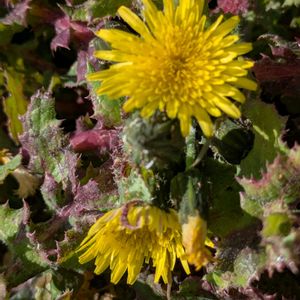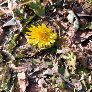 たんぽぽが咲いていました。葉っぱはまだ、寒さで紅葉したままです。