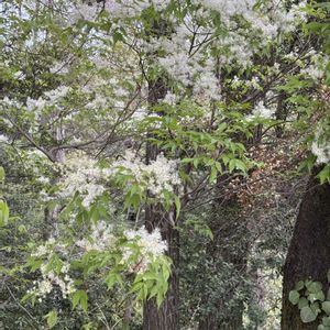 近所の雑木林で見かけた木に咲く白い花 ①②4/6携帯で撮ってみました。 2本あって②はまだ咲き始め。少し黄緑が残っているような色です。 近づけない場所なので ③④⑤4/8カメラで撮ってみました。 私の望遠レンズではこれが限界ですが、白いフワフワの花が雲のようにきれいですね。 白く細い花弁が4枚、雄蕊が2本あるように見えます。 アオダモの雄花だと思います。 調べると花が咲くのは5年に1度とかでてくるのですが、毎年は咲かないということかしら? 来年も咲くか確かめてみなくちゃね(^^)♪