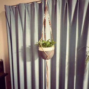 床に直置きしてたポトス。 掃除の際に邪魔だから、マクラメ編みを頑張って吊り下げてみた。 尻尾はまだ切ってない。