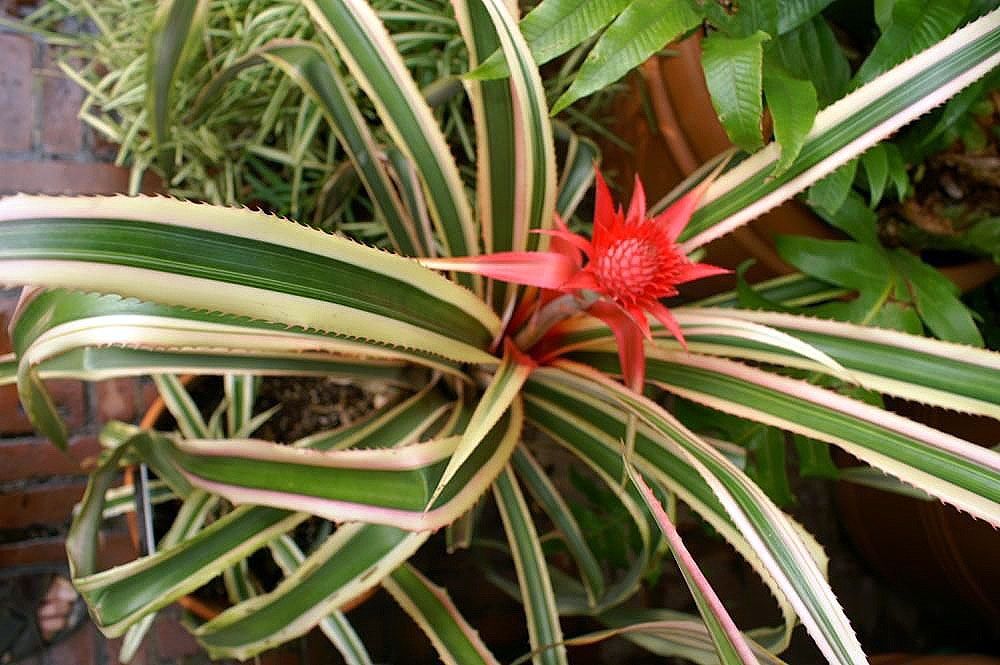 美しいカラーリーフ・プランツとして人気のアナナス・ブラクテアツスは、本当に食べることのできる果実(赤色のパイナップル!ただし普通のパイナップルよりも種が多い)がなる可能性があることも楽しみのひとつ。