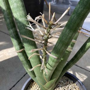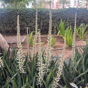サンセベリア•キリンドリカ 散歩道にて。 植栽のサンセベリアが、一斉に花穂をあげている姿が美しいです。まだ蕾ですが、咲いているところでは甘い芳香も。