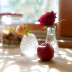 夜中にこっそり ⌯'ᵕ'⌯♡ 今日のお花 リンゴ 姫リンゴ🍎ちゃん 今朝カット✂した子たち 🌹🍎並べて📷 おつかれさまでした˖*.✧゜ おやすみなさい💤