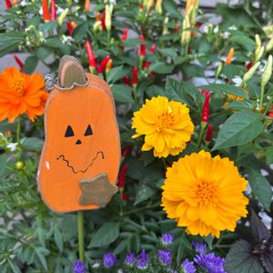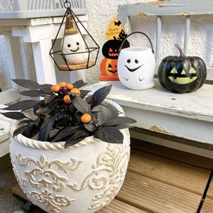 玄関前を少しハロウィン仕様にしました🎃 観賞用とうがらし(オニキスマジックオレンジ)を購入。1株植えです。 ハロウィン雑貨も少し飾りました♪