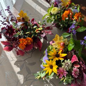 ①昨日は花遊び教室をしました、ハロウィン🎃バージョン👻 ②ジニアを入れてジュランタ宝塚がアクセントに。 ③主にダークな色でまとめてシックな感じに。 ④マリーゴールドやジニアを入れて賑やかな感じに。 ⑤今日は最高気温が20度🍂庭から花を選んで準備する時間が楽しい1日でした。
