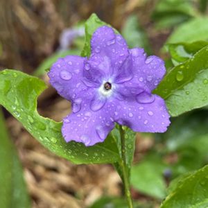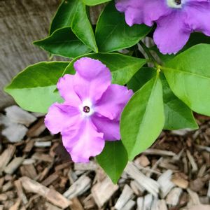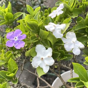 「ニオイバンマツリ」 9月27日am5:59頃 ✧p📷qω•,,´)パシャ✧ このくらい咲くのは、今春からもう何度目だろうか? 4回は咲いたと思う。 茉莉花と同じで気温さえ合えば、何度でも咲くのかもしれないです。 屋上に来ると良い香りがしています。 このニオイバンマツリが、僕としては初めての木を育てるきっかけになったんです。 5~6年程前に、姉から、これいらないから育てる❓ と言われて貰ってきたのが、このニオイバンマツリでした。 手渡された時に、えっ!軽い‼️と思った。 鉢も小さかったので、姉から鉢も貰って、屋上に行って鉢から出すと、土が殆ど無くなっていた。 貰った鉢へと植え替え数日が経つと、付いていた葉っぱが全部落ちた😲 死んでしまったのかと思い暫くそのままにしておくと、紫色の葉っぱが出てきた。 あのまま捨てないで良かった。 姉宅には、もう1鉢ニオイバンマツリがあった。 屋上のニオイバンマツリも段々元気になって花を咲かせるようになった。 見事に咲いた時に、姉宅のニオイバンマツリを見ると、僕の勝ちですね。 花の量が全然多かったです。 そんなことがあり、 大きくなったニオイバンマツリを3回ほど鉢増ししてきました。 冬になると、落葉樹では無いのに、葉っぱが落ちますが、春にはまた芽吹いてくれます。年に1、2回 肥料をあげています。 手入れの仕方がまだまだ分からないですけど、年に何度も咲いてくれて嬉しいものです。