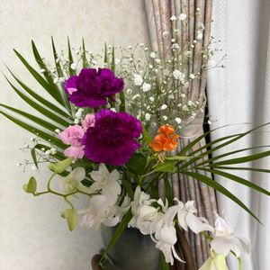 おはようございます お花を生けました カーネーション ユカリバイオレット バラ・ラベンダーイリシュカ カスミソウ・ベールスター デンファレ・サクラホワイト アレカヤシ お花屋さんが届けてくれます ふるさと便 今月は山形産のシャインマスカット GSのお友達から教えて頂きました,感謝です とてもずっしりして見事です 昨日の夕焼け 不思議な色でした 薔薇が咲いていました 気がつかなかった ニオイバンマツリ 紫から白に変わっていました