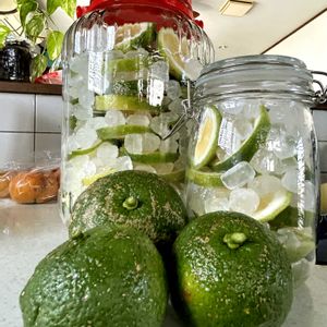 こんにちは😃 庭のカボス収穫祭🤭 シロップ漬けにしました フレッシュです 香りも🙆♀️ 小さい瓶🫙は、娘の嫁ぎ先に🍹