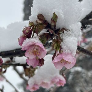 咲き始めた河津桜も すっぽり雪を被っていました🌸 🏷️今日のお花 雪の公園では 子供達が楽しそうに 雪遊び☃️🛷❄️ 公園を横切り私は‥ ホテルへまっしぐら😅 🍓の産直販売があるんです😋 ①②公園の河津桜🌸昨日 ③④は昨年3月岡山のお寺 ⑤埼玉産あまりん🍓ゲット🤗