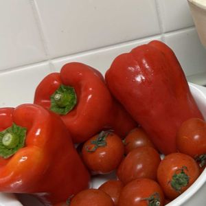 採れたてトマトと赤ピーマン (パプリカとの違いがよくわからないけど)をたくさんいただきました🎶 生で食べても甘いのでマリネとやらも作ってみたいです😋