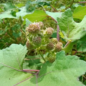 オオオナモミ(大葈耳)キク科オナモミ属 田んぼまわりに咲いてるひっつき虫です。 9月28日に咲いてたお花、10月5日には若い果実になってました。 1⃣ 9月28日 上の丸いのが雄花 2⃣ 9月28日 葉の下、蟹のハサミのようなのが雌花です。 3⃣ 10月5日 4⃣ 上 9月28日 下 10月5日 5⃣ こんな感じで田んぼの横に生えてました。 雄花はやや小さな球形で雄しべが目立ちます。 果実を小さくしたような雌花には糸状の柱頭が2本あります。 原産の帰化植物で、衣服に付着する「ひっつき虫」として知られています。かつて日本に生えていた在来種の「オナモミ」は、このオオオナモミに取って代わられてしまいました。