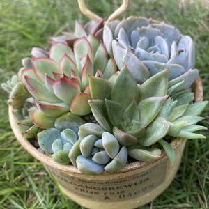 おはようございます😃 涼しい朝はどこへ?! 昨日はいくつか植え替えと寄せ植え作りました♪ 自分用と、実家の寄せ植え仕立て直しです☺️いつも崩れてしまう実家の寄せ植え😭おく場所や、水やり違うので仕方ないのかなぁ😅定期的に チェックして手直し。ほぼ全部植え直しですね🤣一枚目は自分用 2枚目は実家用👀あまり詰めないで、セダムも入れてません管理し易いかなー 植え替えはもう鉢が窮屈💦トランペットピンキーさん鉢増しました ブルーバードさんは、ずっと白いペイントの素焼き鉢からグリーンのに変更 エレガンスさんも、グリネと一緒に缶から素焼き鉢に引っ越し🎵ドリームローズさんは、缶から素焼きの小さな鉢に鉢下げしました😊あまり合わない子や成長良くない子は替えてみるのも良いかも😆