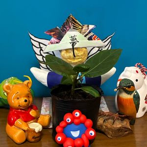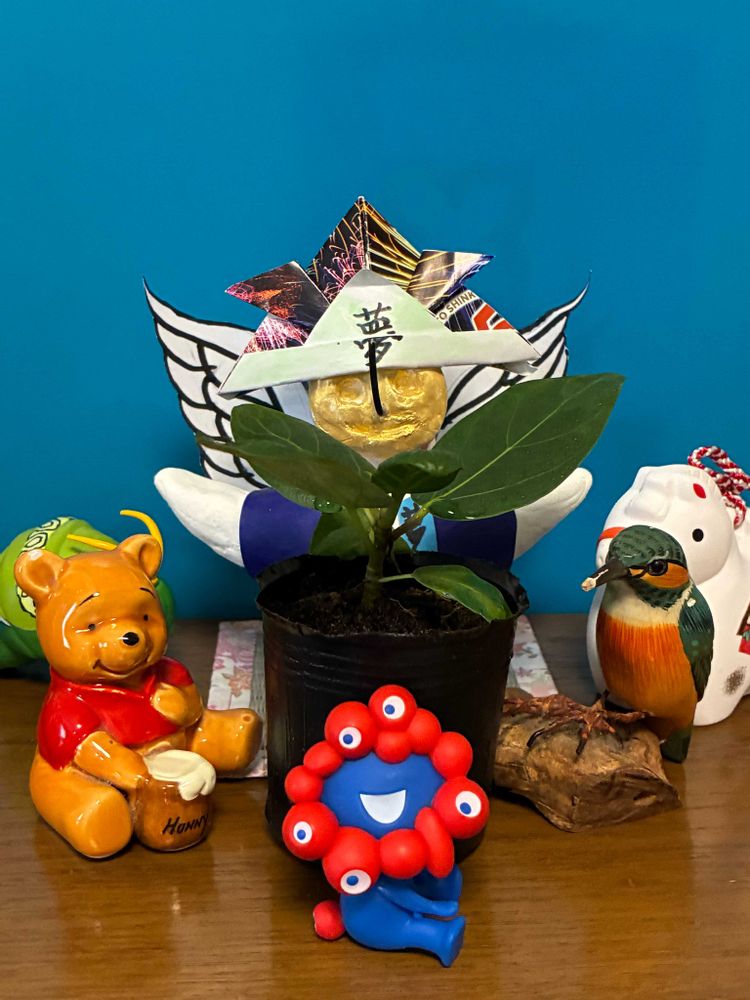 『永遠の幸せ』。丈夫で強い生命力を持っていることが由来とされています。明るい印象の黄色の斑が入った葉が特徴で、インテリアグリーンとして人気があります。ゴムの木の仲間です。