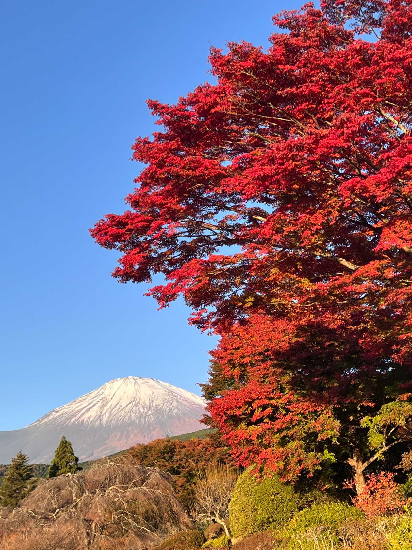 大きな紅葉の木の向こうに富士山🗻
