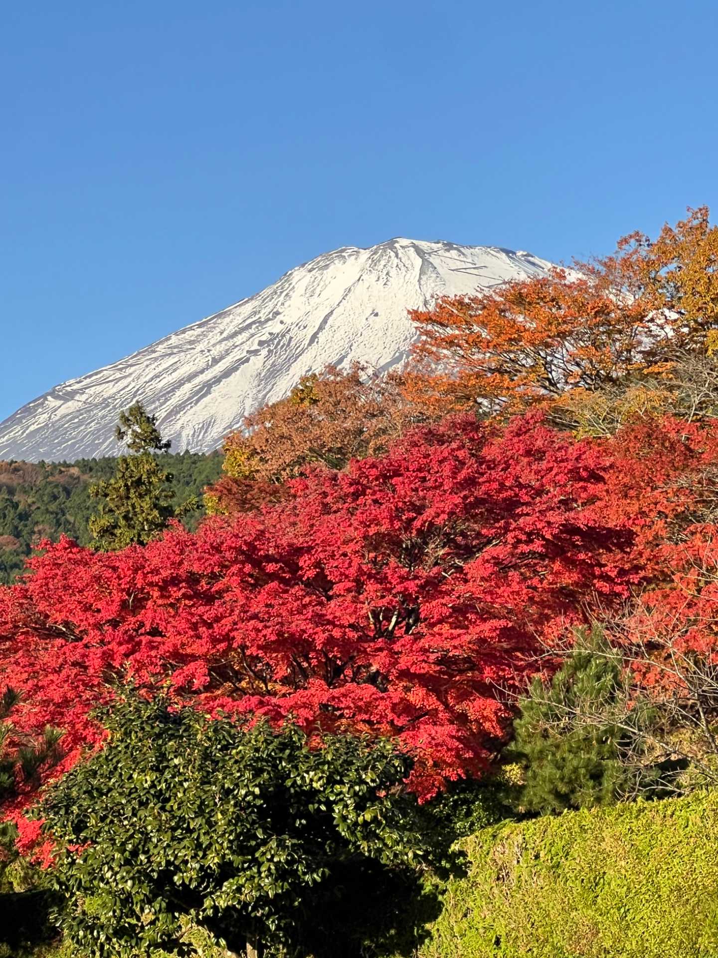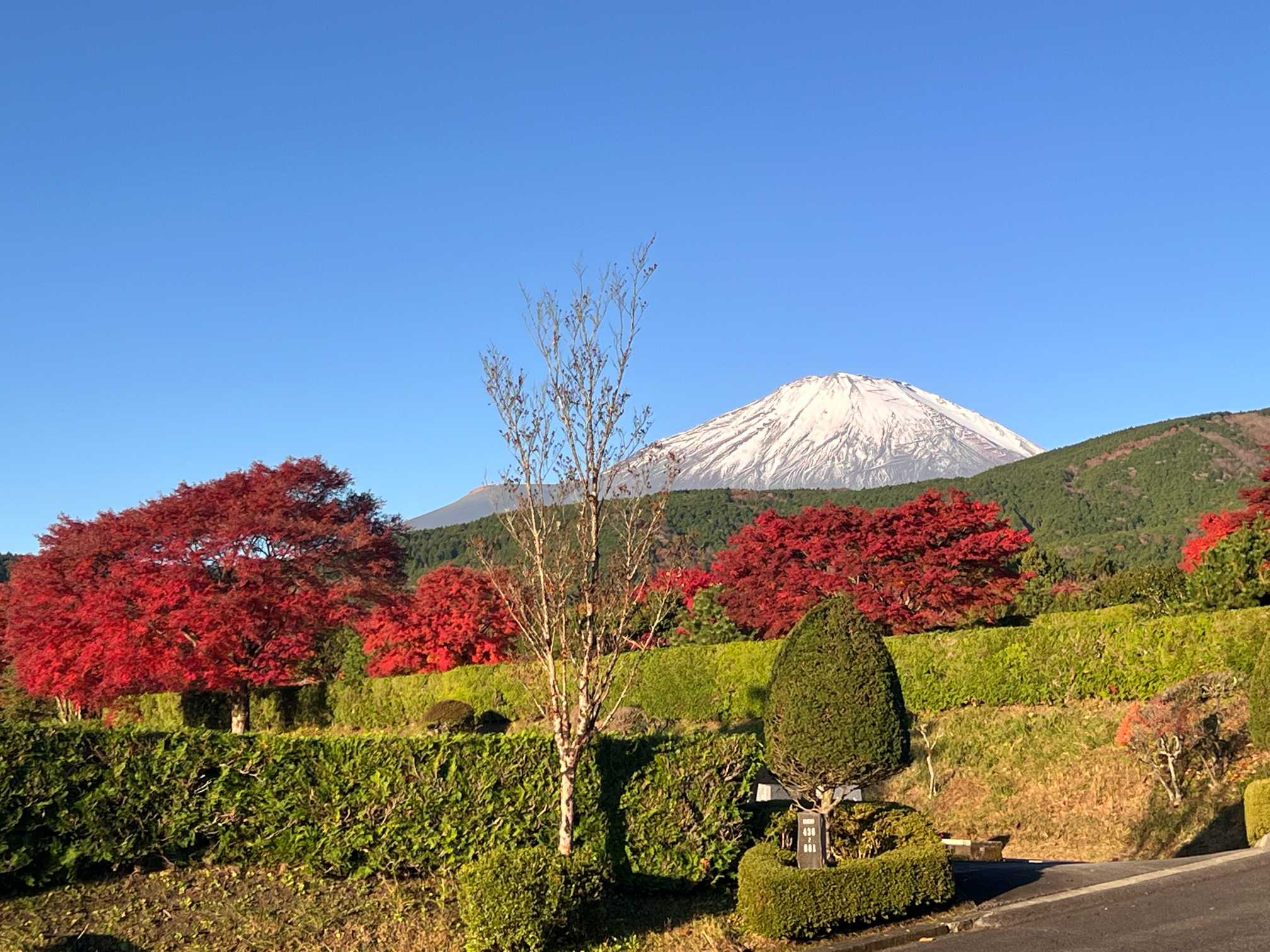 振り向くと富士山が紅葉の上に凛として雪化粧です