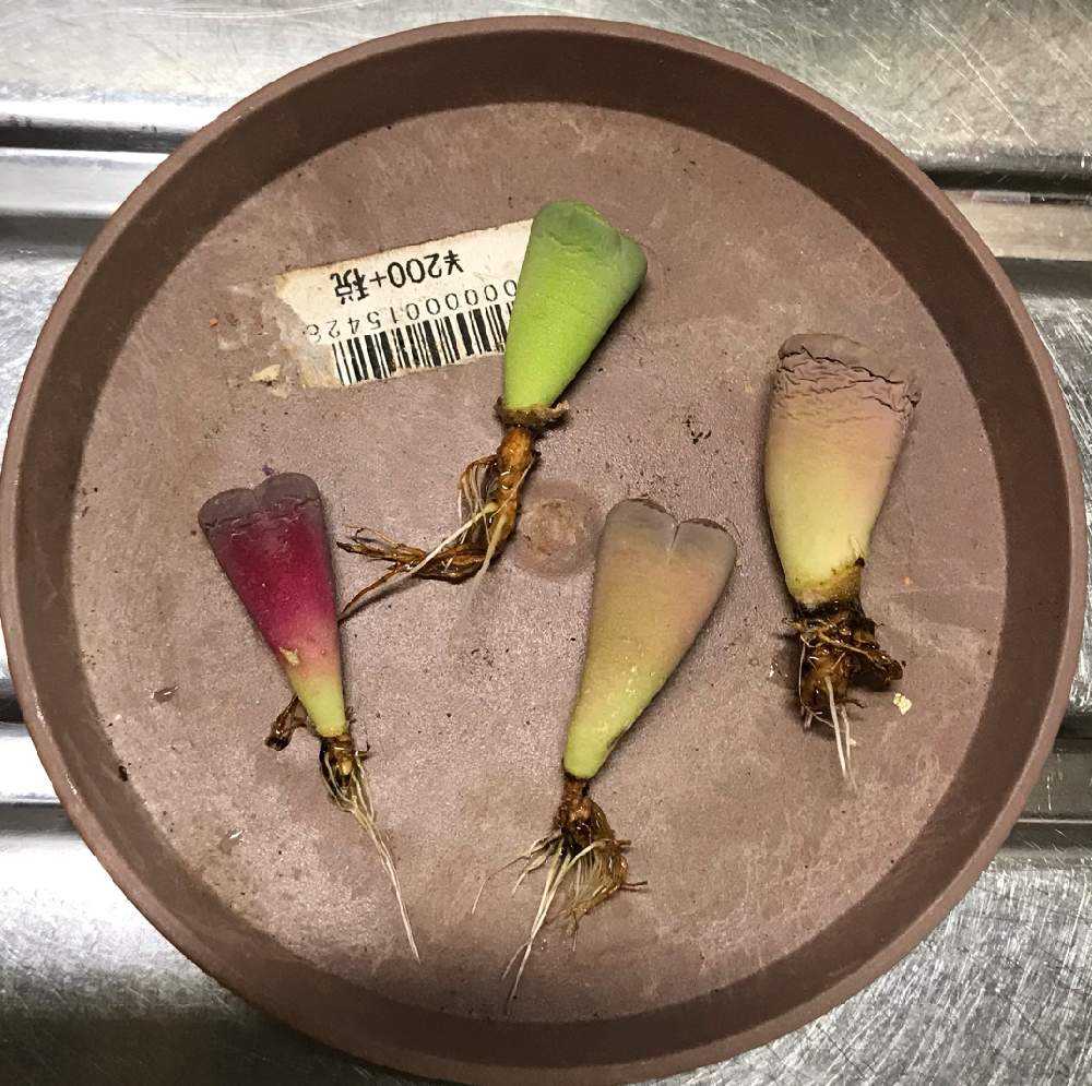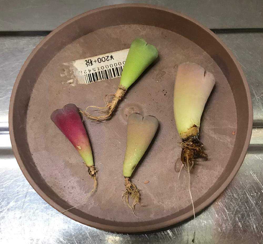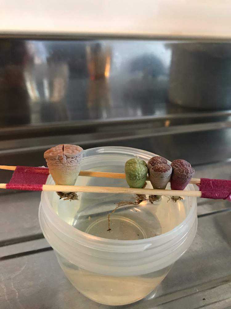 シワシワリトープス達の根っこを良く見ると、全員、すごく小さいけど白い根っこが出てる