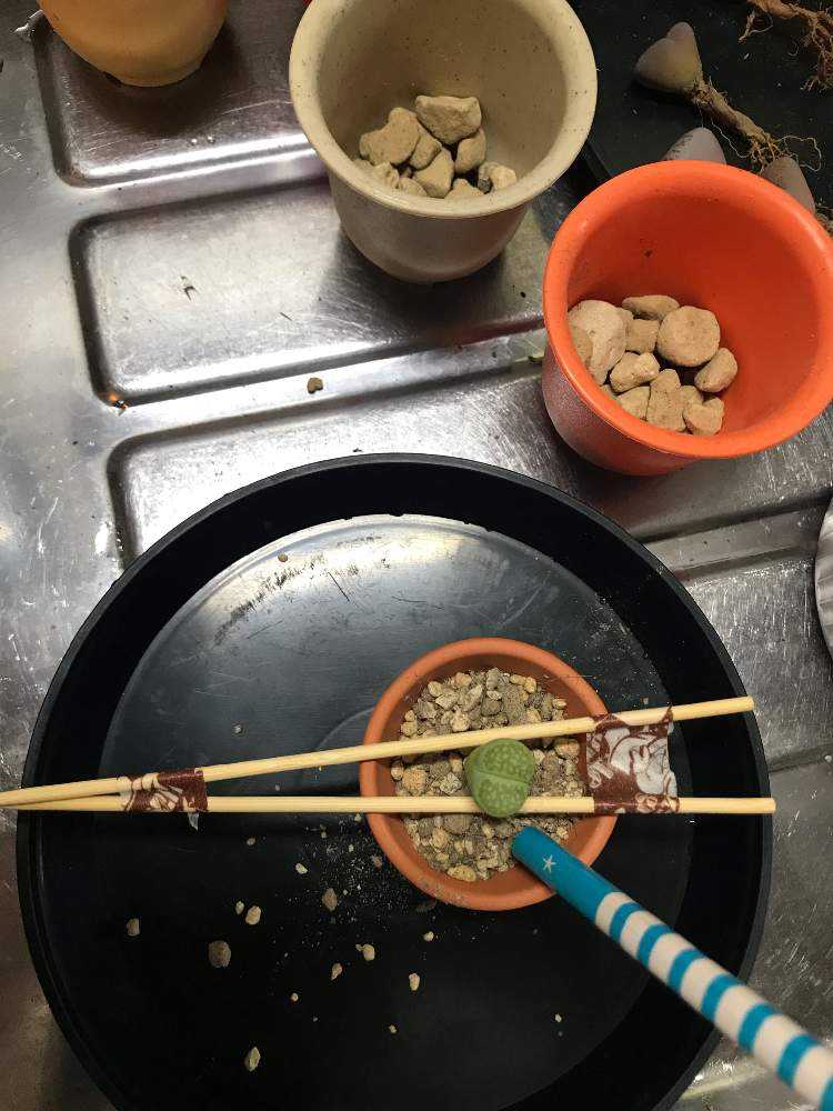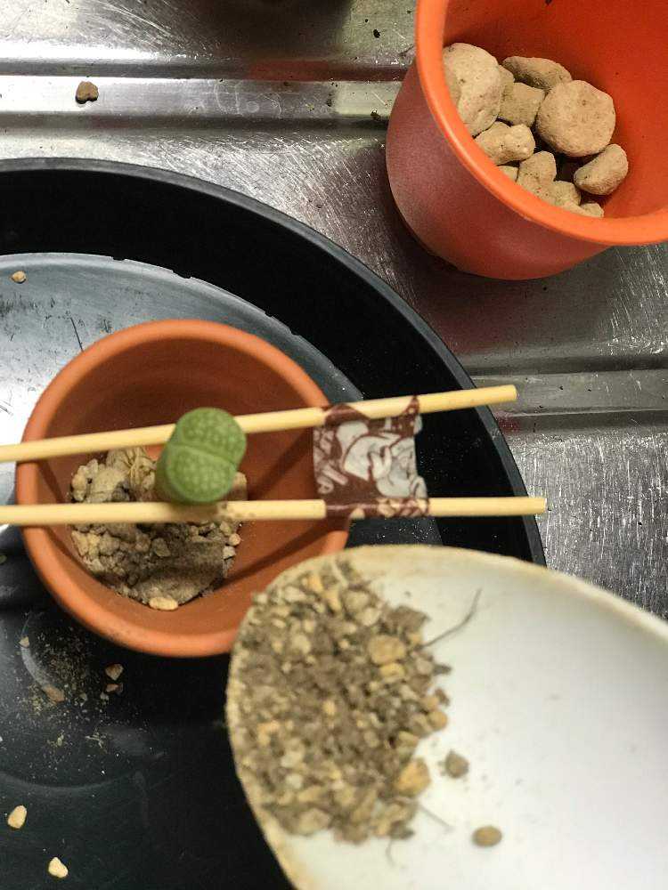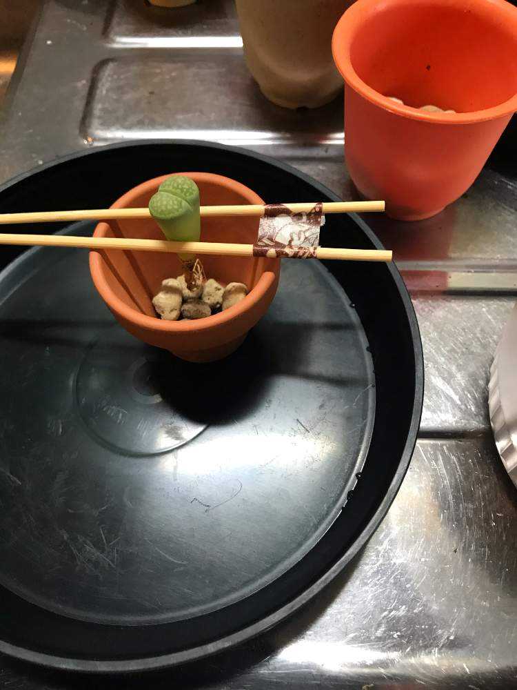 鉢が小さくて手で固定するのが難しいので竹串2本をマスキングテープで止めたやつの間にリトープスを挟んで、ちょうどいい位置にセット