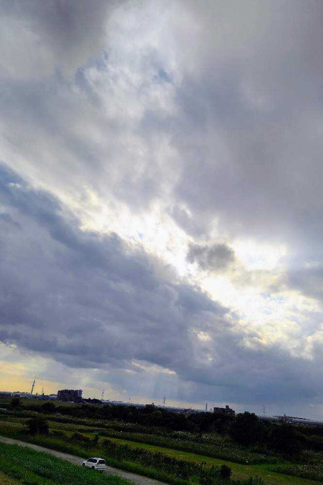 土手から。天使の梯子、遠くにスカイツリー。