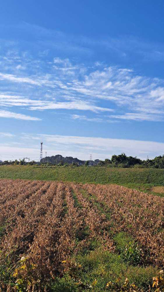 大豆畑を見ながら畦道から通りへ出ました。
