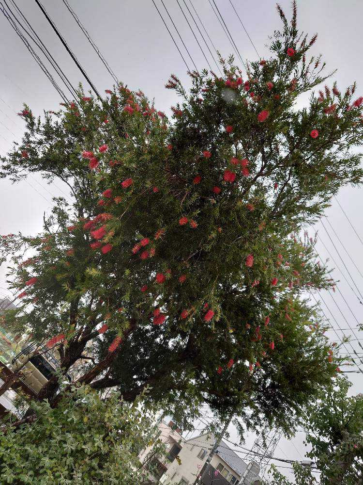 駐車場には大きな赤いカリステモンが