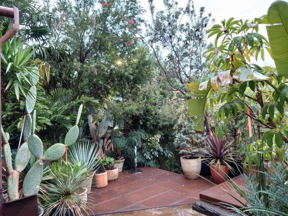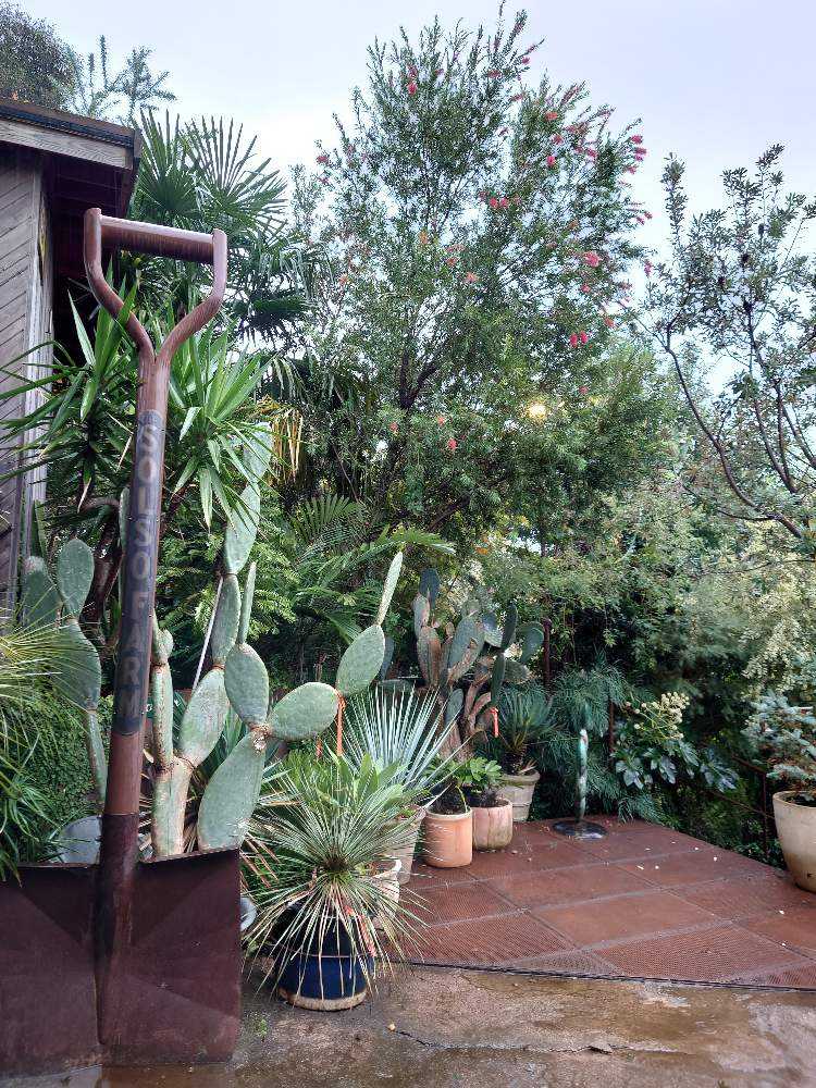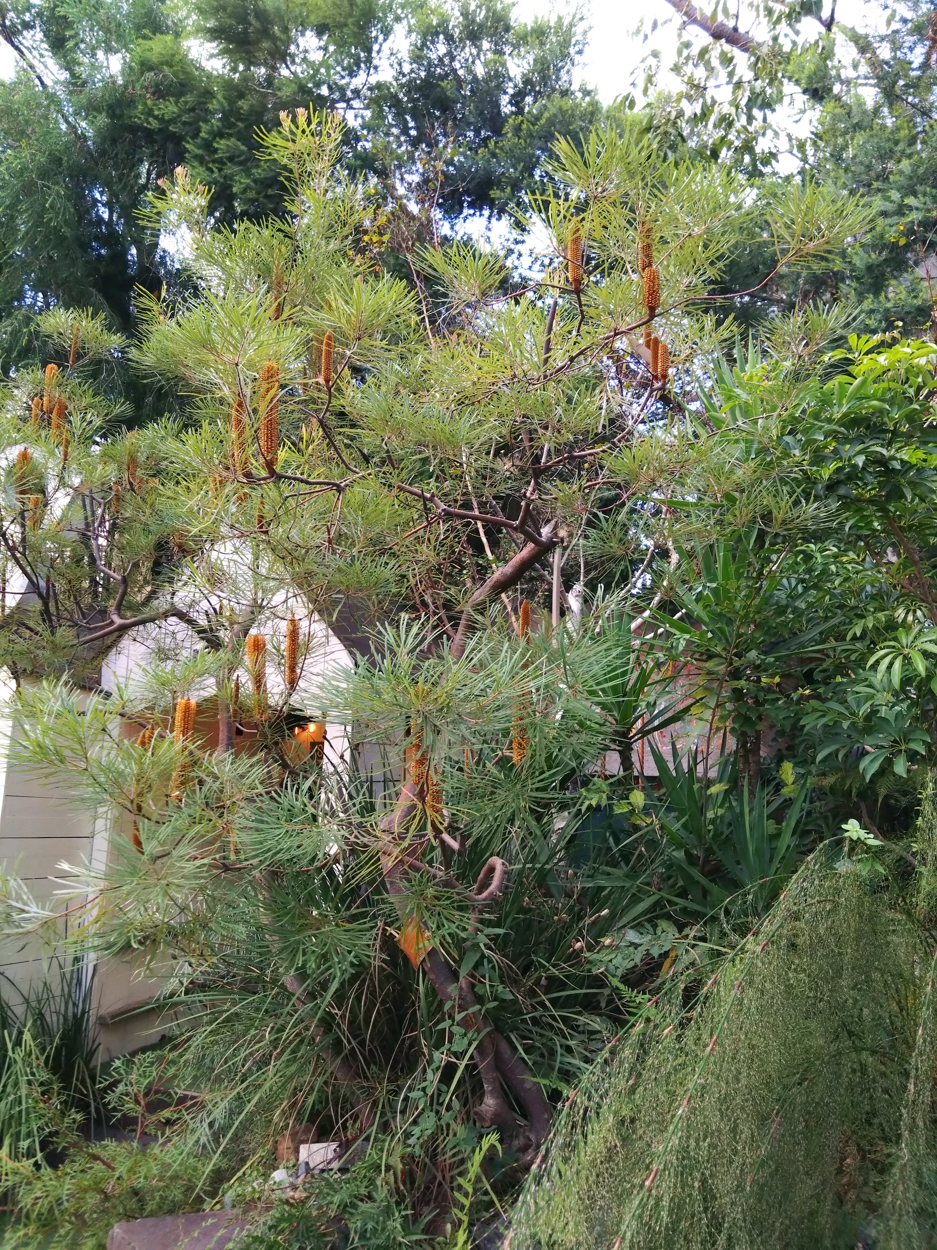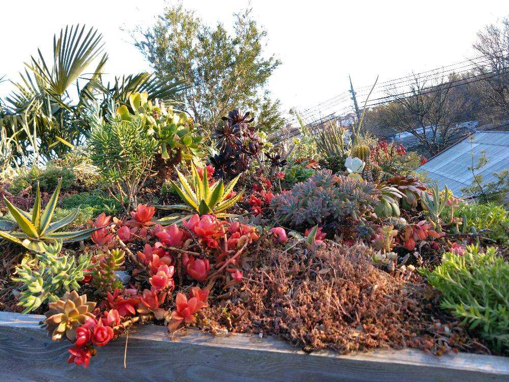 よく見たら大木の立派なとっくり蘭でびっくり❢ほかにも地植えアガベがたくさんあり日陰環境や真冬を越して元気に育っている姿に感動しました。とっくり蘭の足元は逆光になってますがバンクシアロブールでお花が見えます。