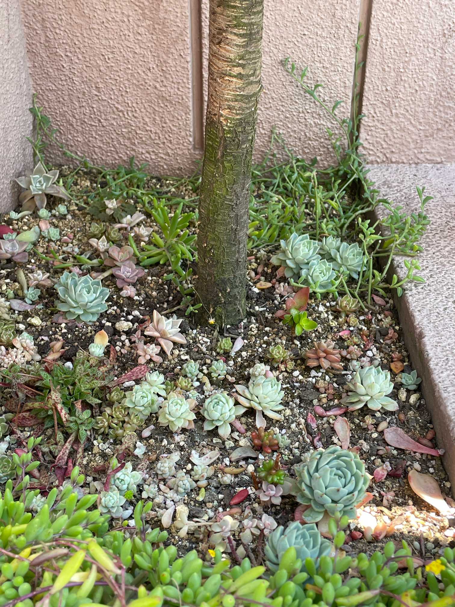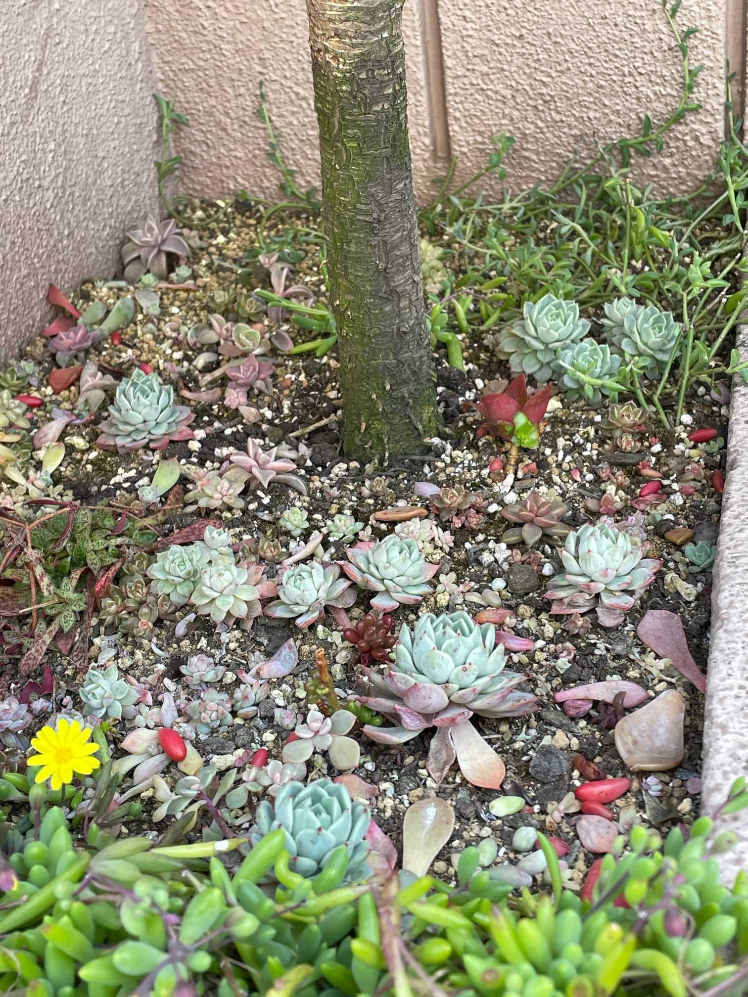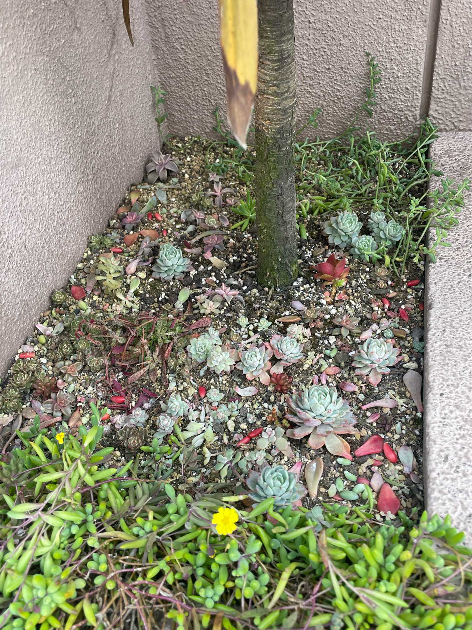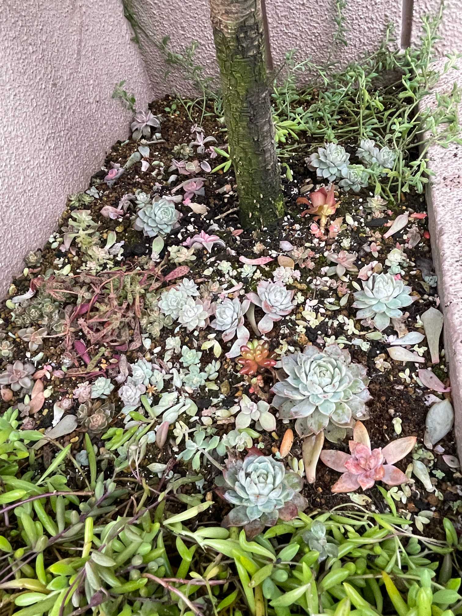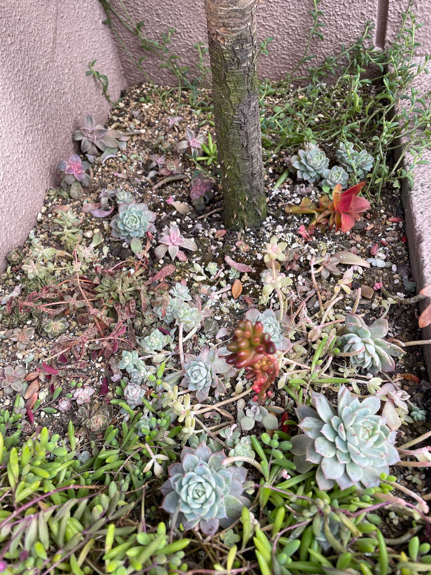 コルジリネ レッドスターちゃん、根っこが張りすぎて 株元に花をあまり植えられなくなりました。そこで、日当たり悪いけど、多肉ちゃんを植えてみたらどうかと💡 「育つかな?」と植えてみたところ、なかなか いい感じに育ってきてます🌱