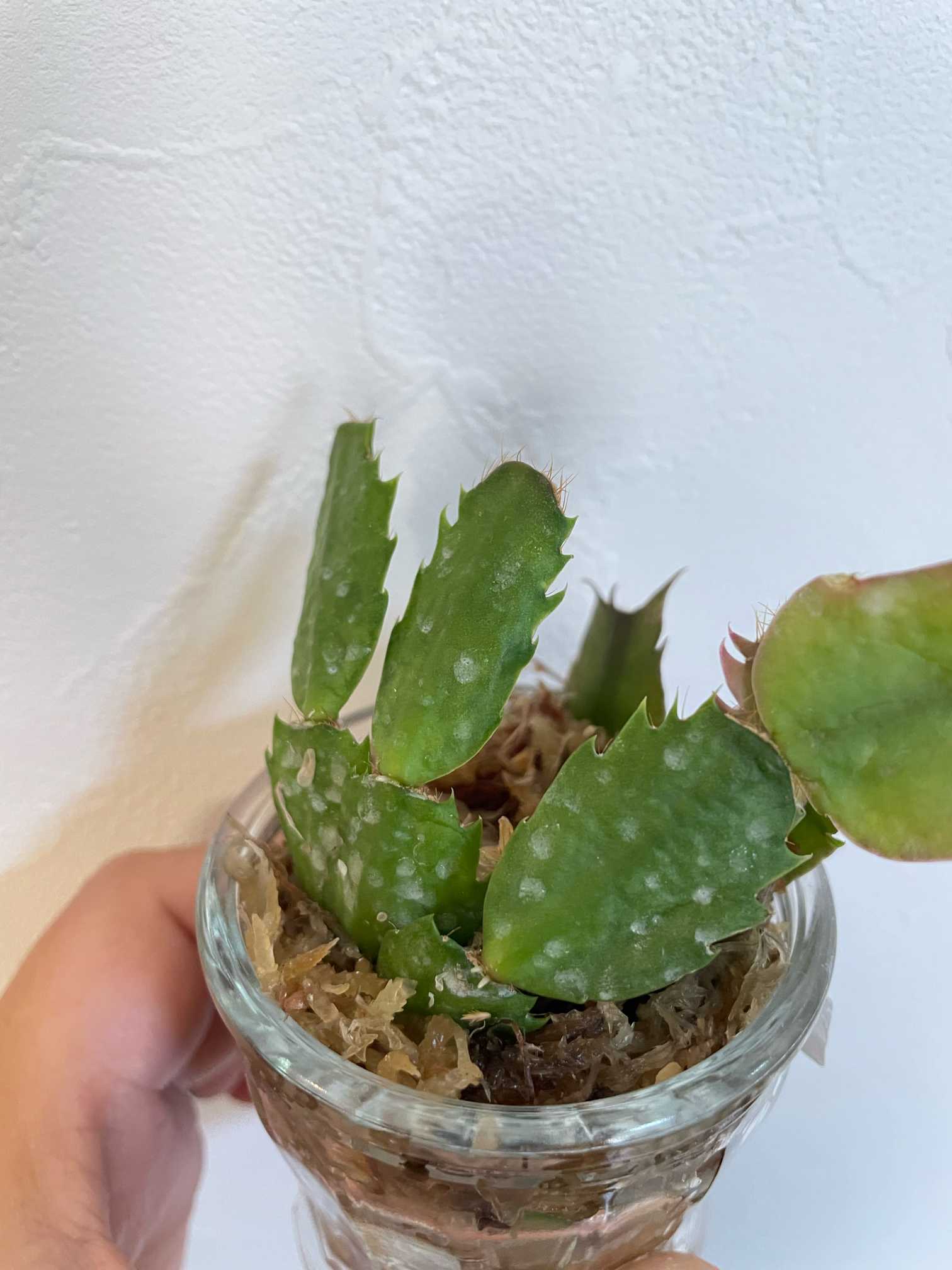 結局、一度苔をバラしてダブルマンゴーの根が出ているところは切って差し直すことにしましたが、結論から言うと、やらない方が良かったです。と言うのも、既に苔に根が絡んでいたようで外そうとするとポチ、ポキと感覚がありました!せっかく伸びた根を切ってしまったかもしれません。苔と根の見分けもつきにくく、下手に触らない方がいいと判断、一番ねが出ているダブルマンゴーの穂だけ切って苔に差して戻しました。