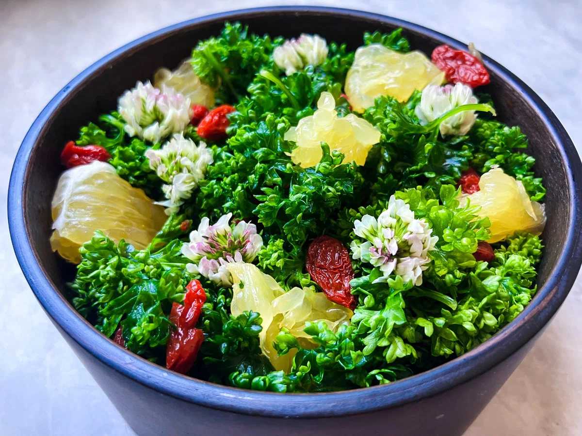 枸杞のドライフルーツをそのまま食べるととカチカチなので水で戻して同じくストレスと貧血に対応してくれる肝に働きかけるパセリさんを軽く湯通ししてこれまた肝のストレス氣滞に対処するのが得意な柑橘と合わせて和え物に