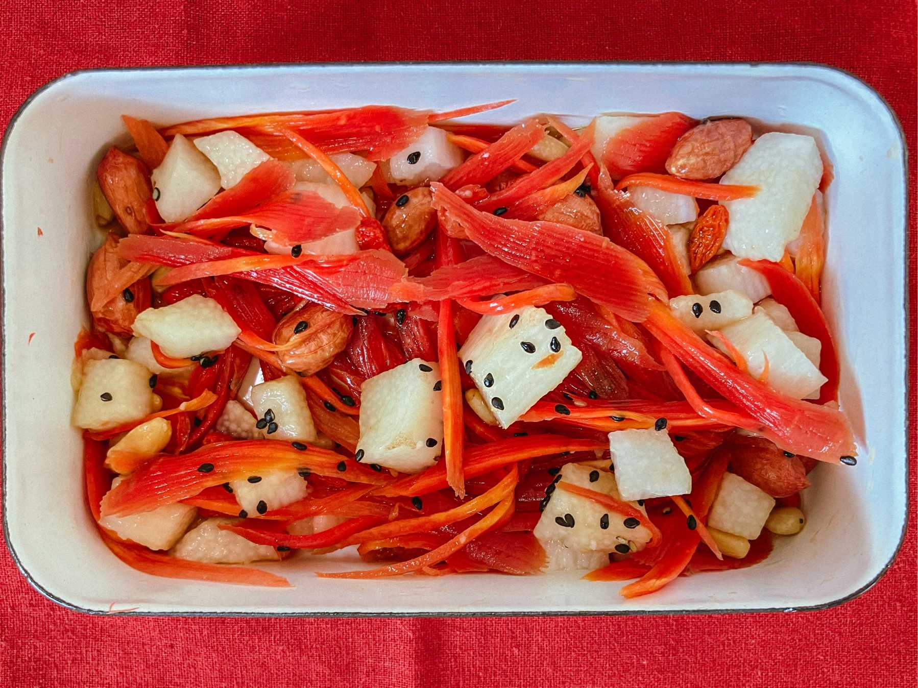 秋冬の乾燥の季節にカサカサしがちな體に潤いと元氣を届けてくれる松の実さんと體の中から温めてくれるカブさんの皮と元氣も潤いも血(ケツ)まで届けてくれる金時人参さんと緑黄色野草であるハマダイコンの葉を合わせ和える