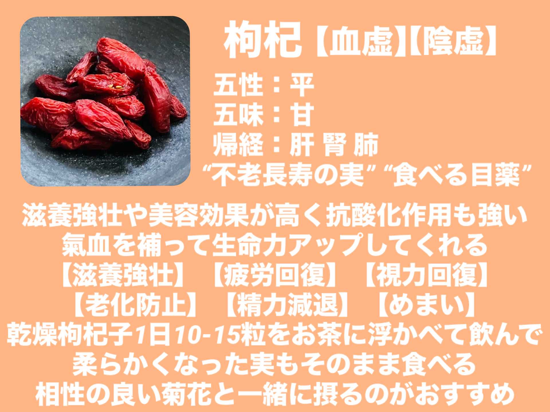 肝腎に働きかけるのが得意な枸杞さんは滋養強壮に加えて美容にまでも氣を配ってくれるスーパーフードとして生命力アップをとことんサポートしてくれる