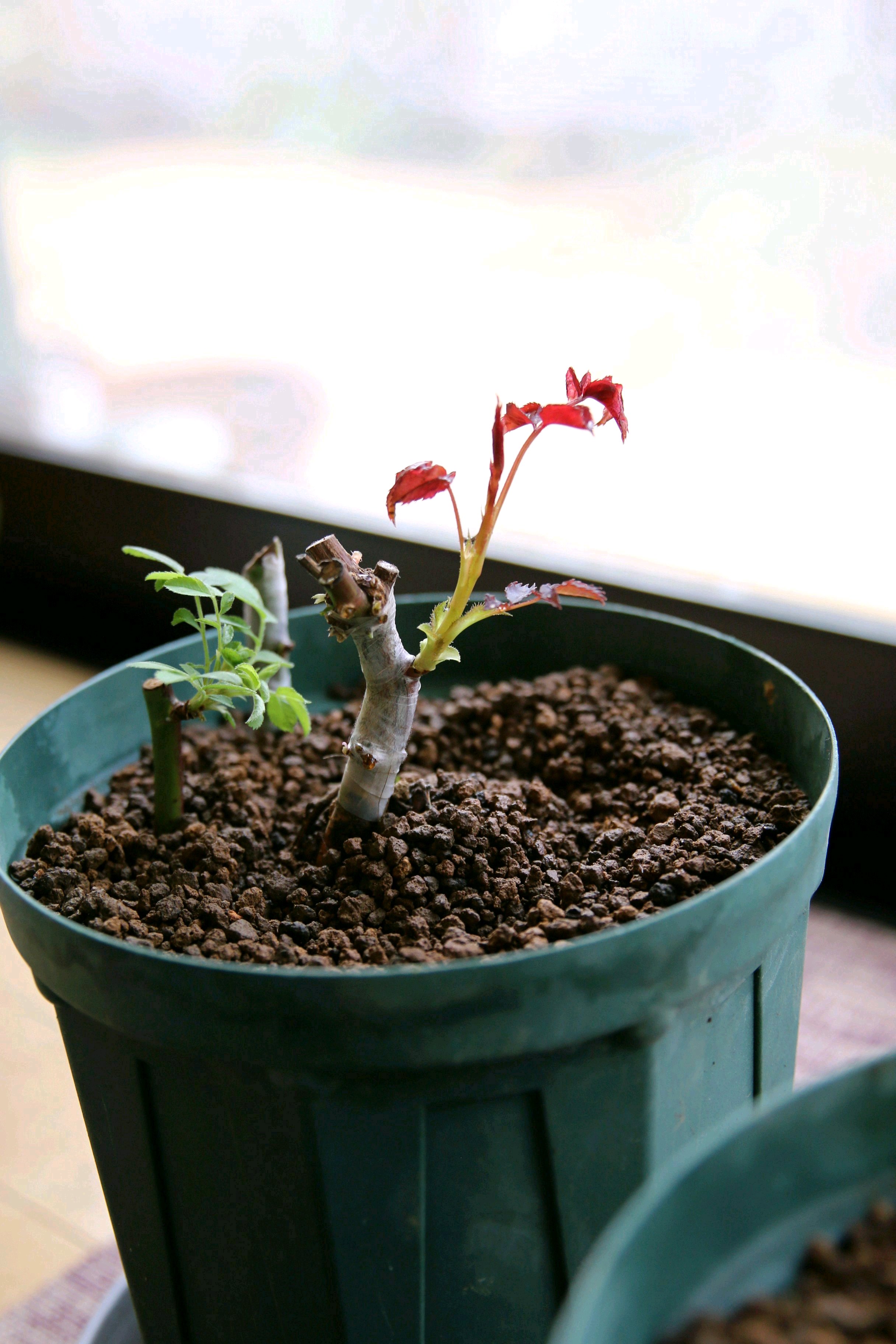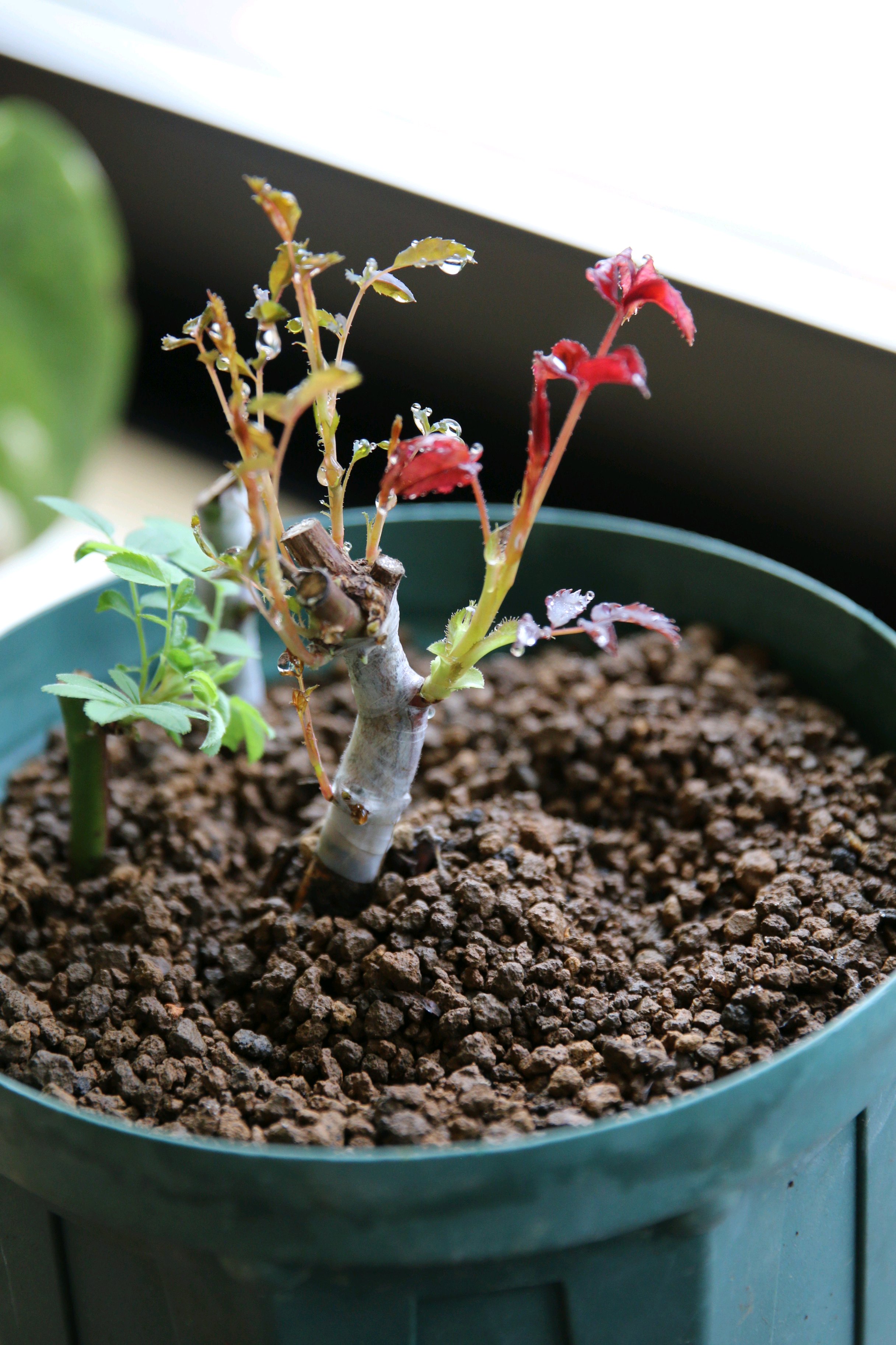 植える前に断面を新しくするために根を切断、その後メネデール入りの溶液に1晩入れました。先生は1時間で良いって言ってたけど。長すぎたかな……。おまけで余ってる野薔薇の枝を挿し木にしてあります。あくまでもおまけ😁