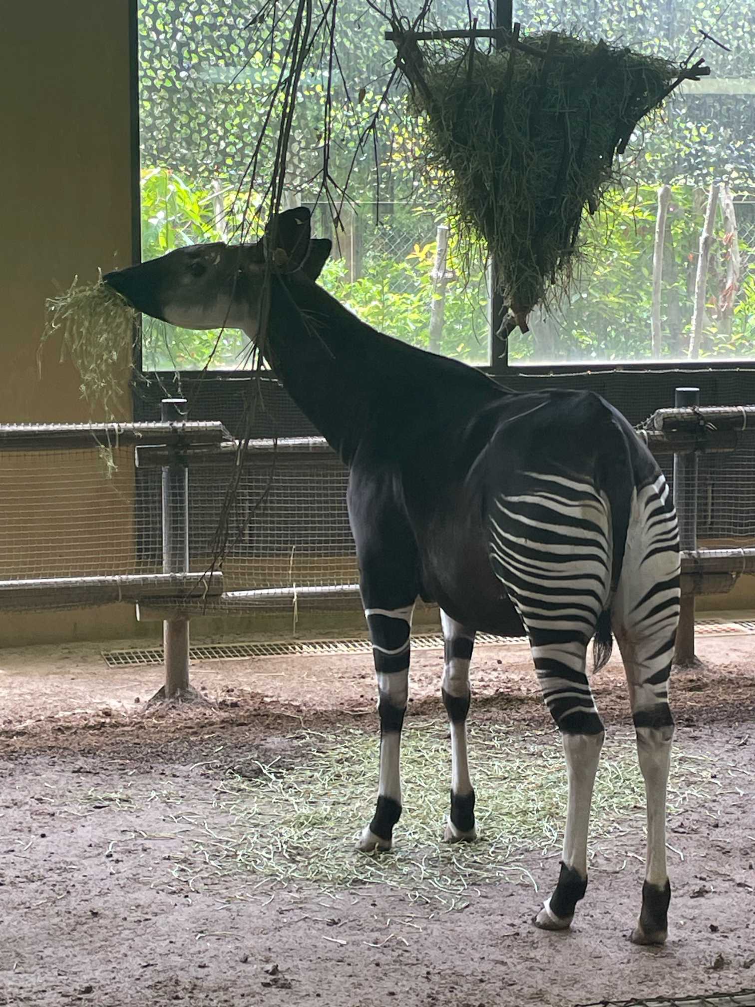 後ろ足とお尻だけシマウマみたい、でもキリン科という、不思議でキュートな動物です。