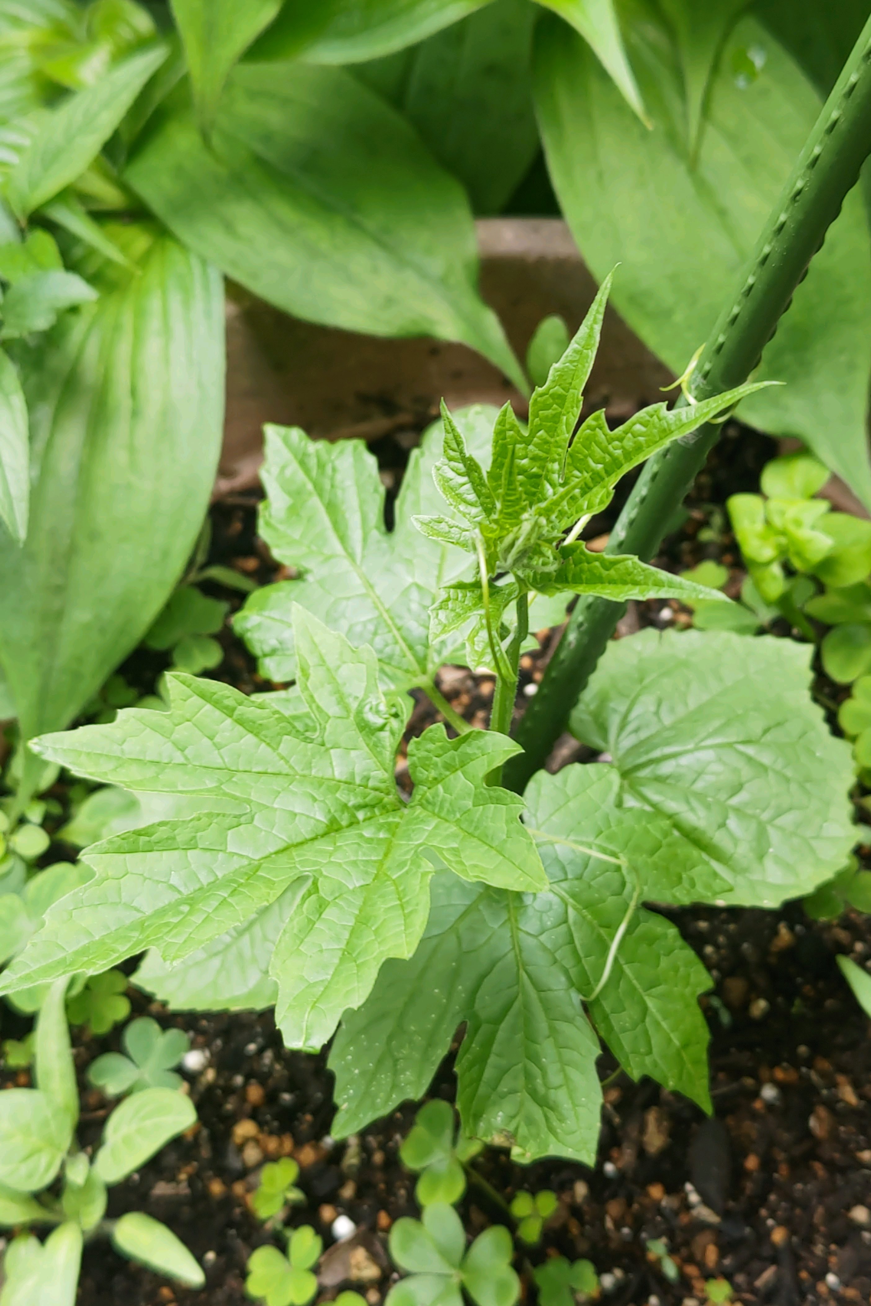 🌿やっと、ツルが四方に伸び、雌花も付いた。