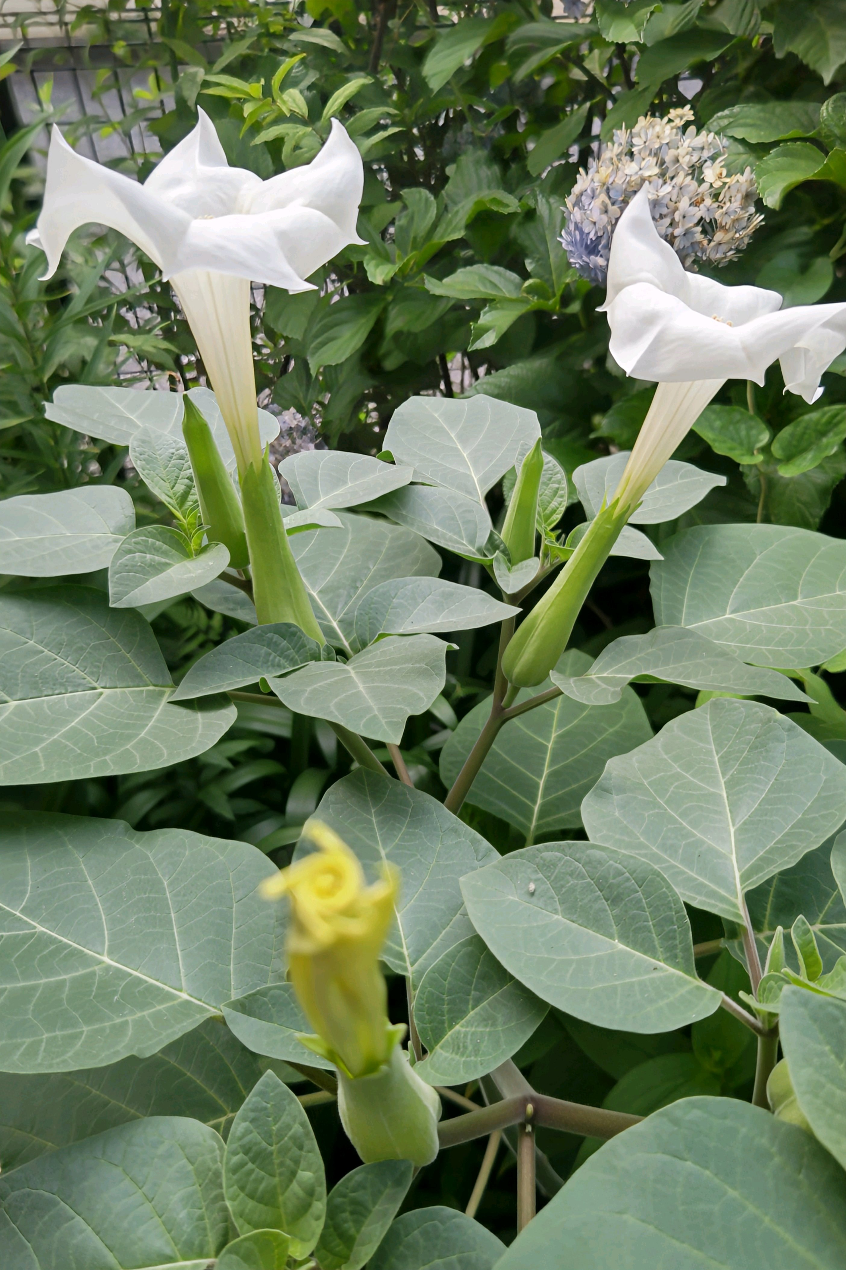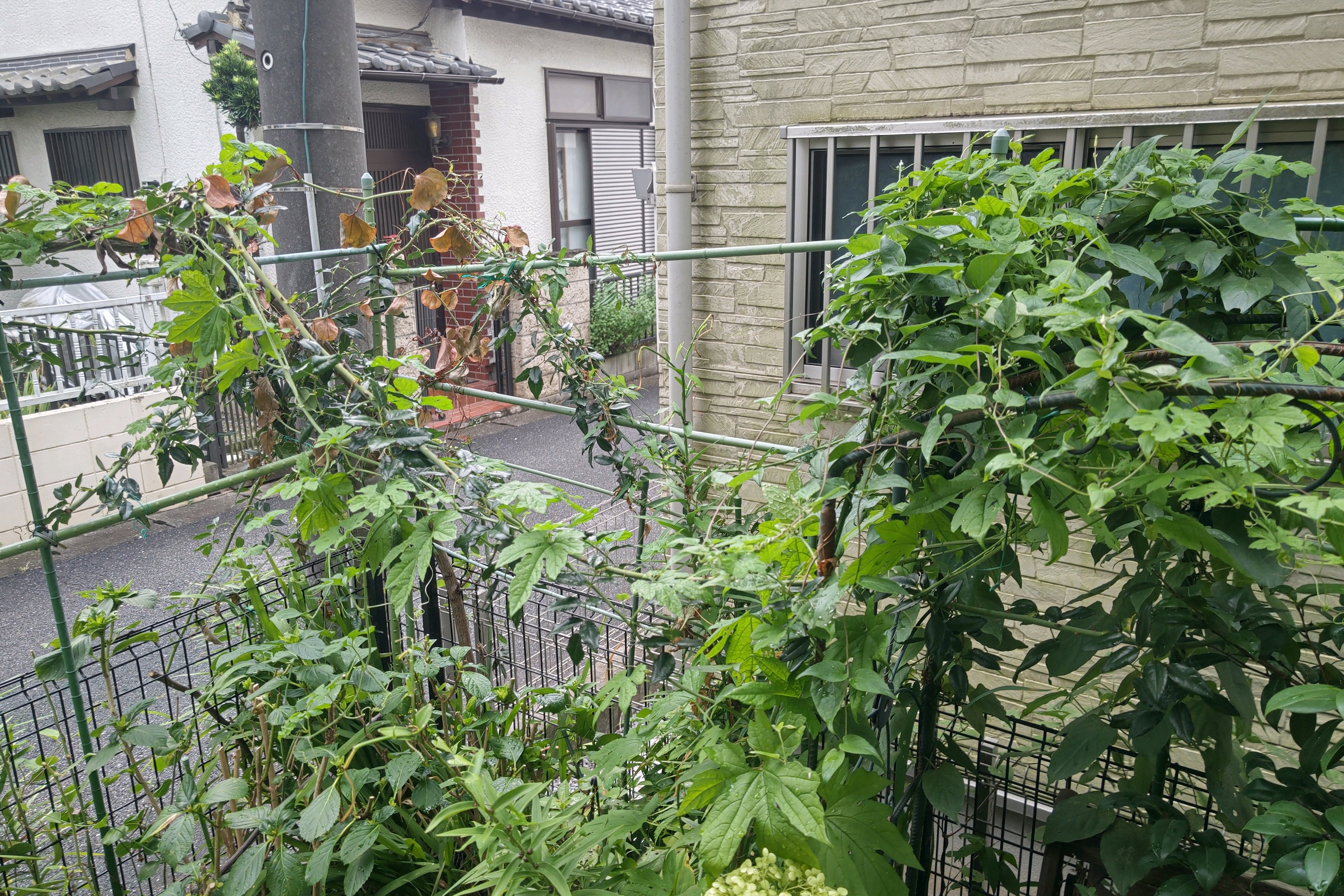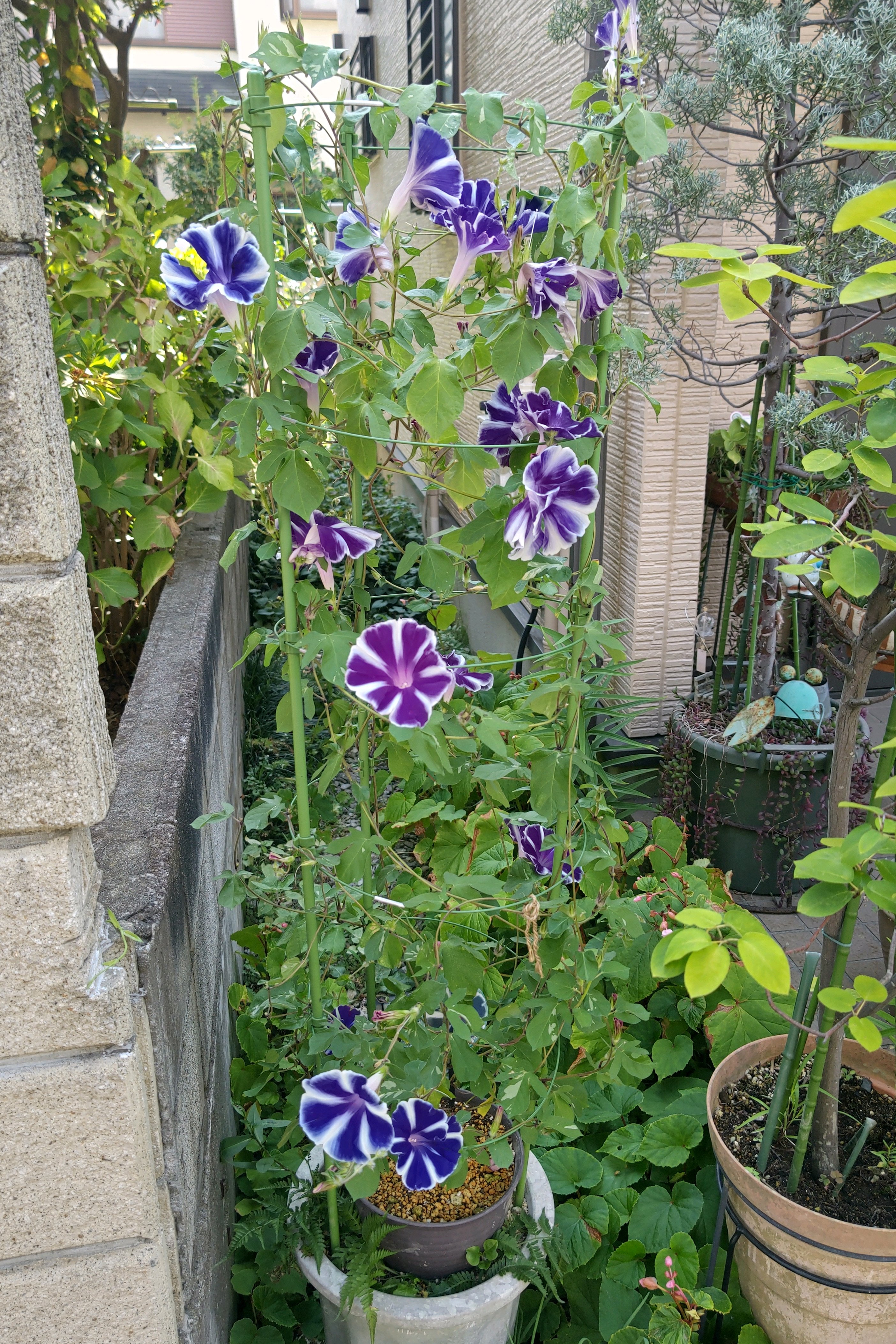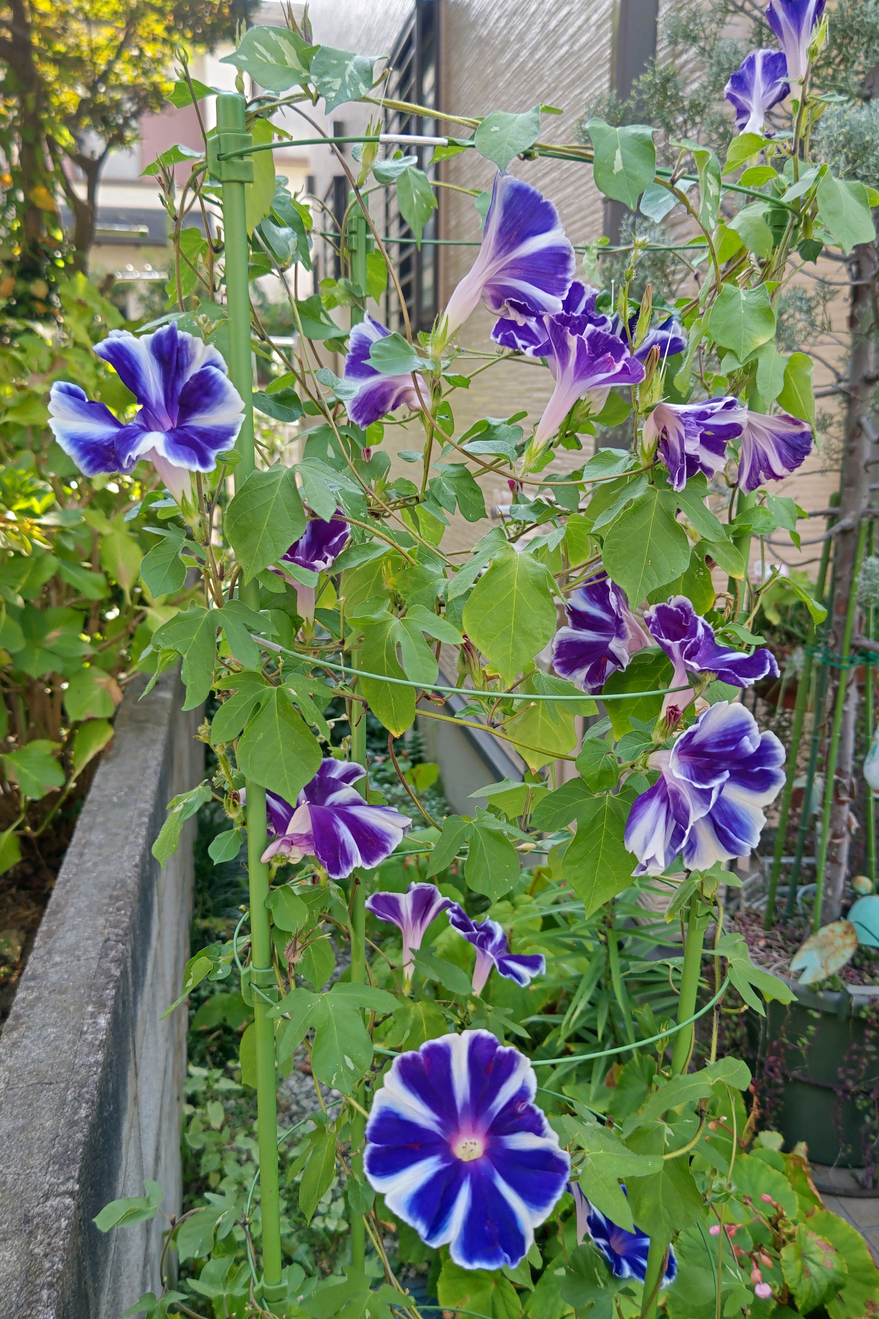 ゴウヤの植木鉢の中で、伸び伸び育った朝鮮朝顔。