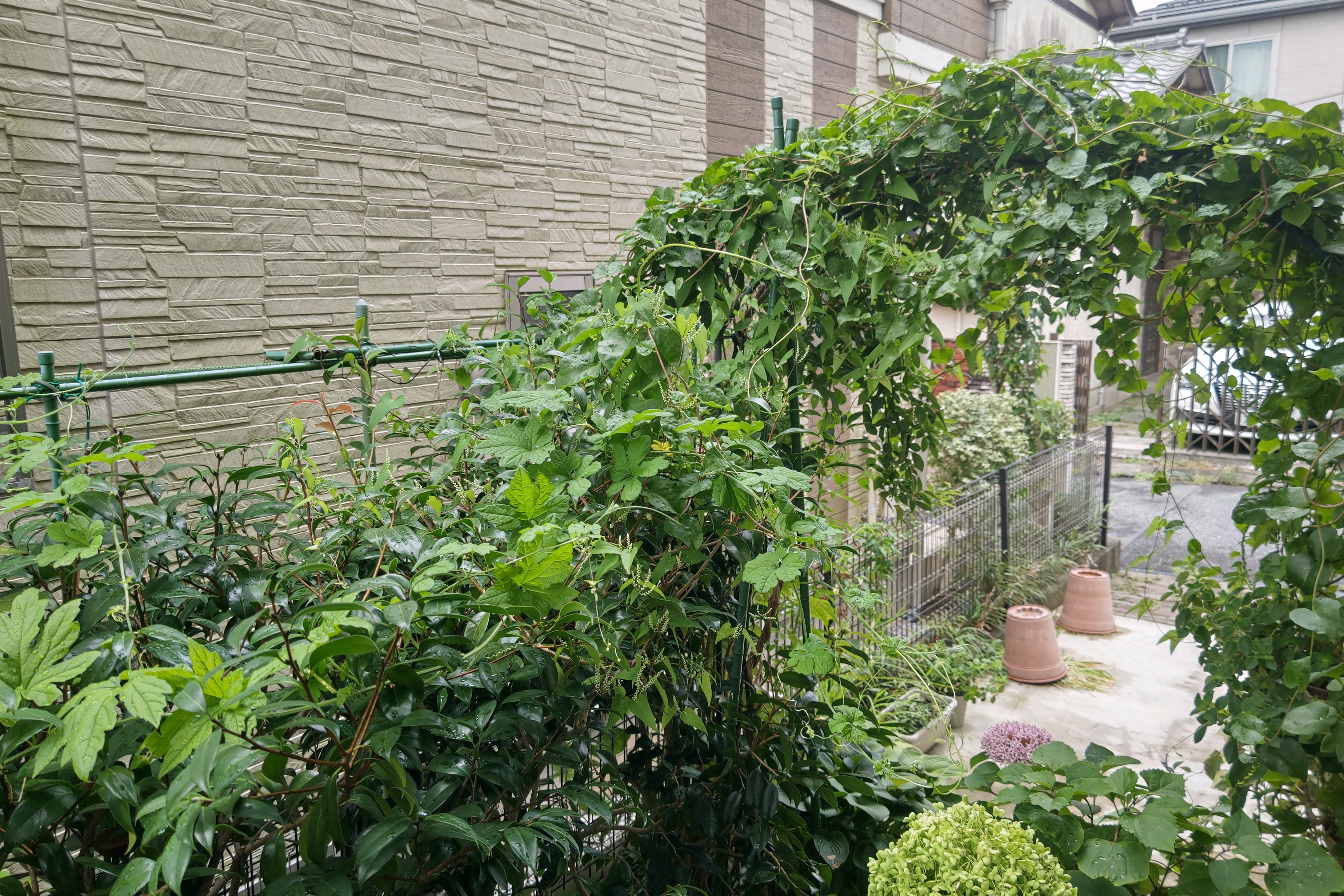 バラのアーチに絡ませた、オカワカメも茂りに繁って😅