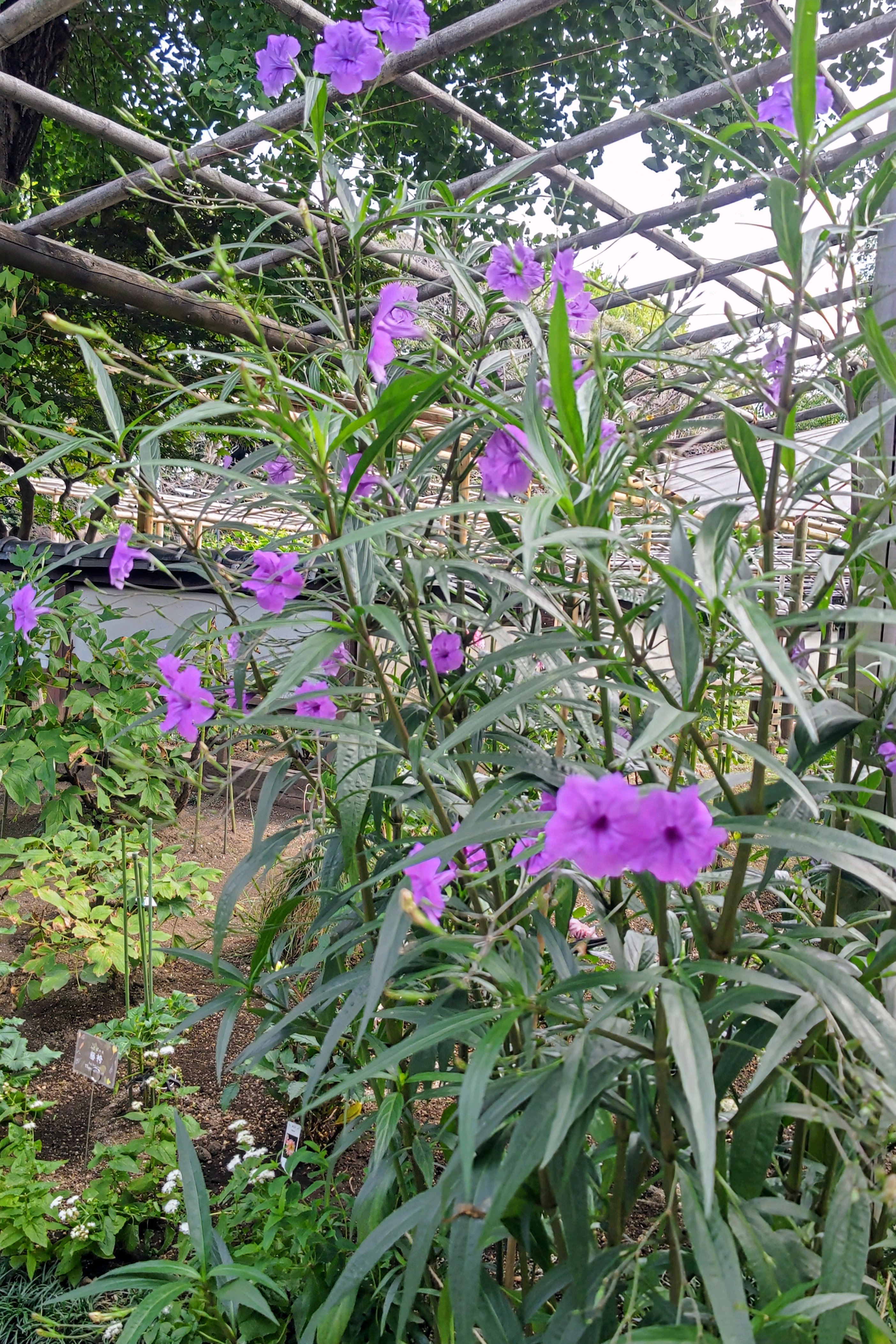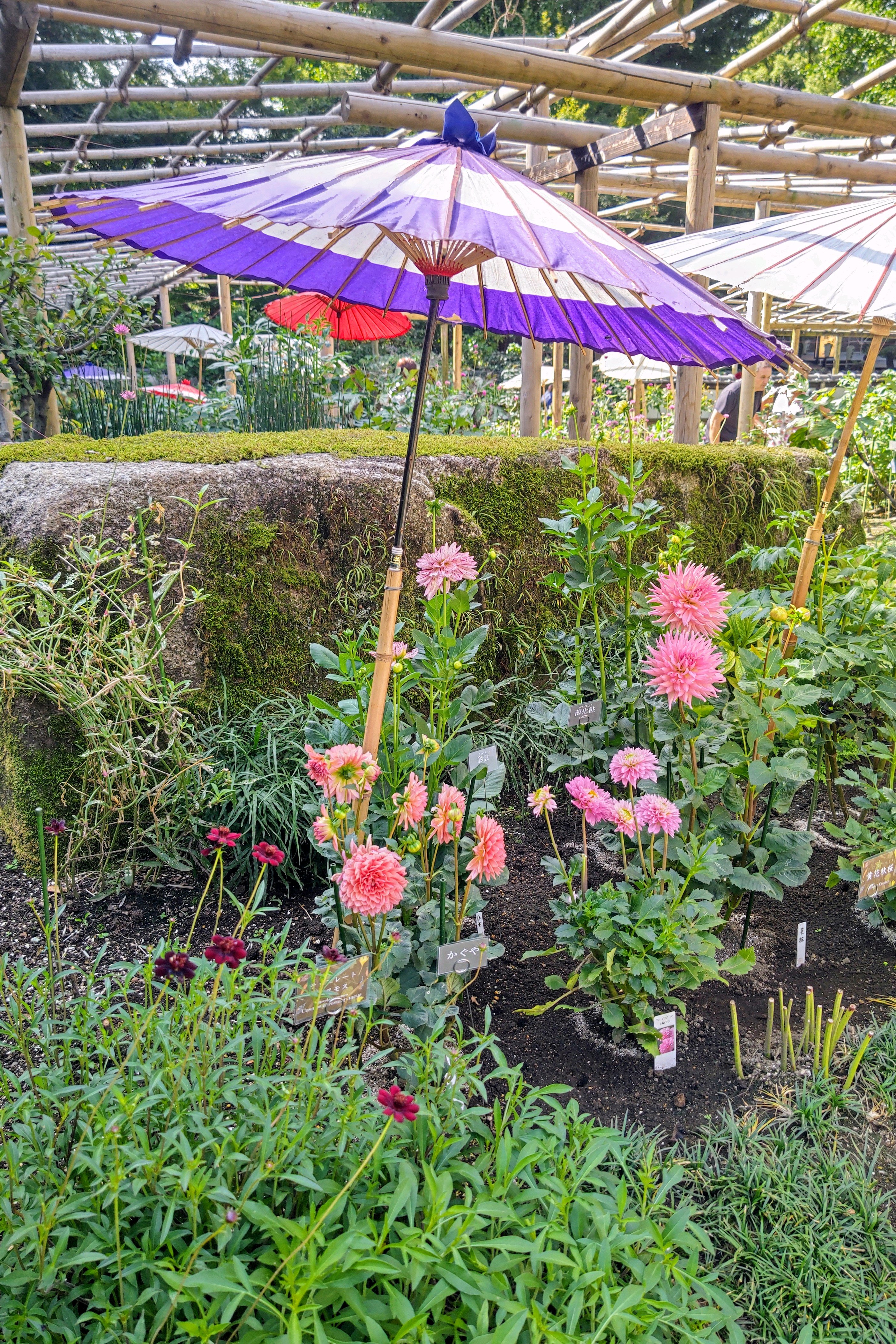 紫の絵日傘の下咲く花。