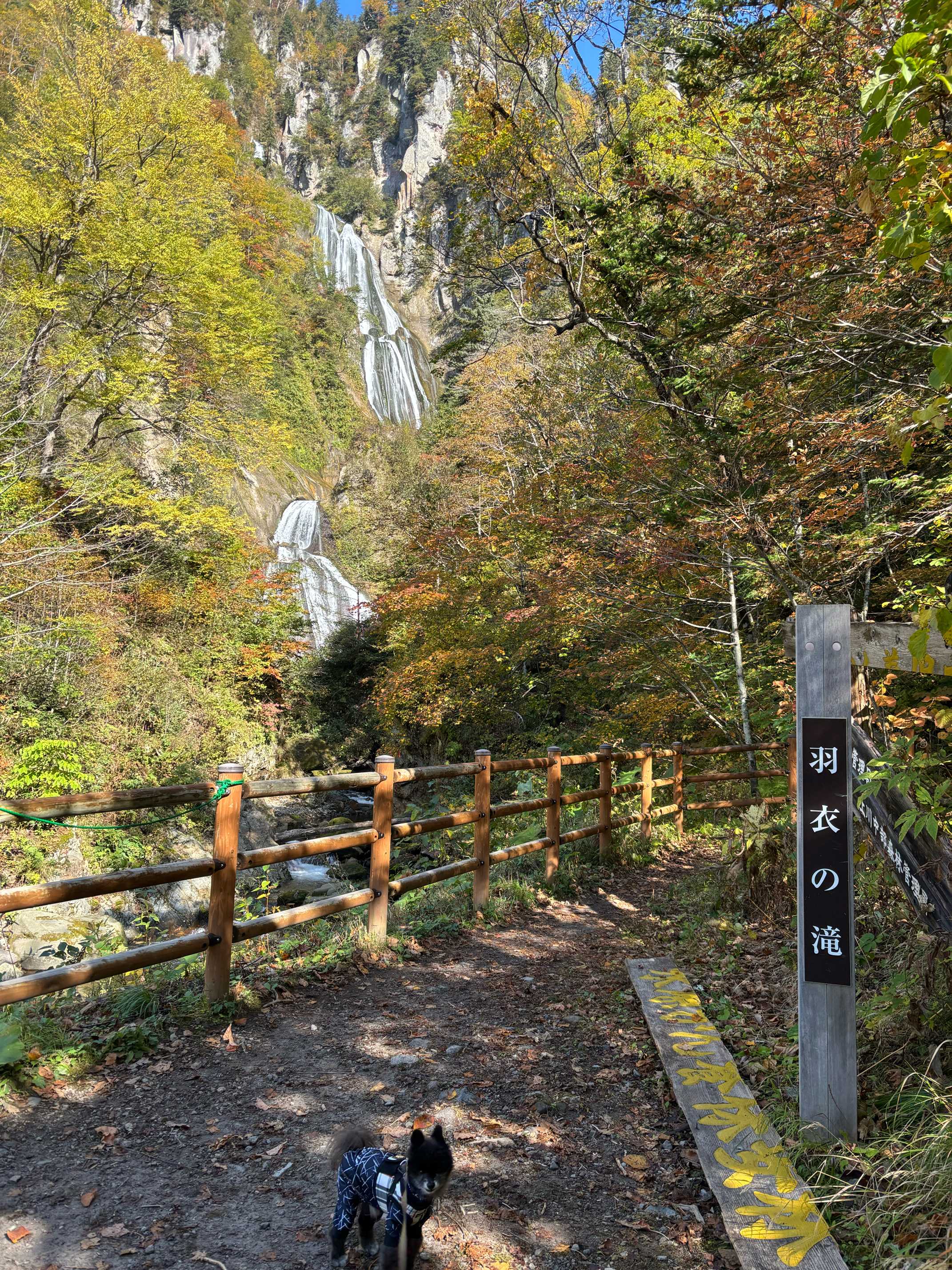 駐車場から羽衣の滝まで20分程度砂利道を歩いていきます