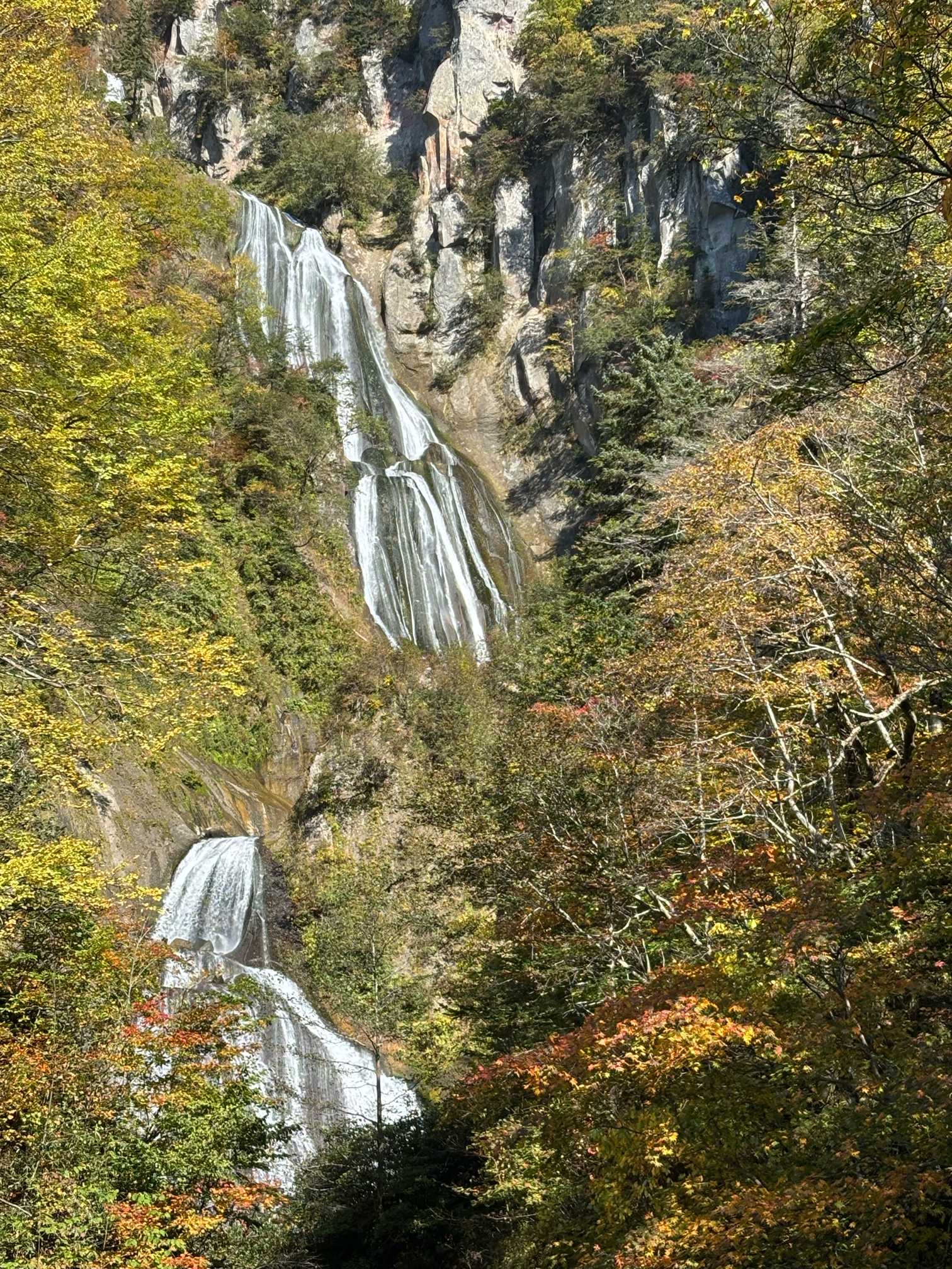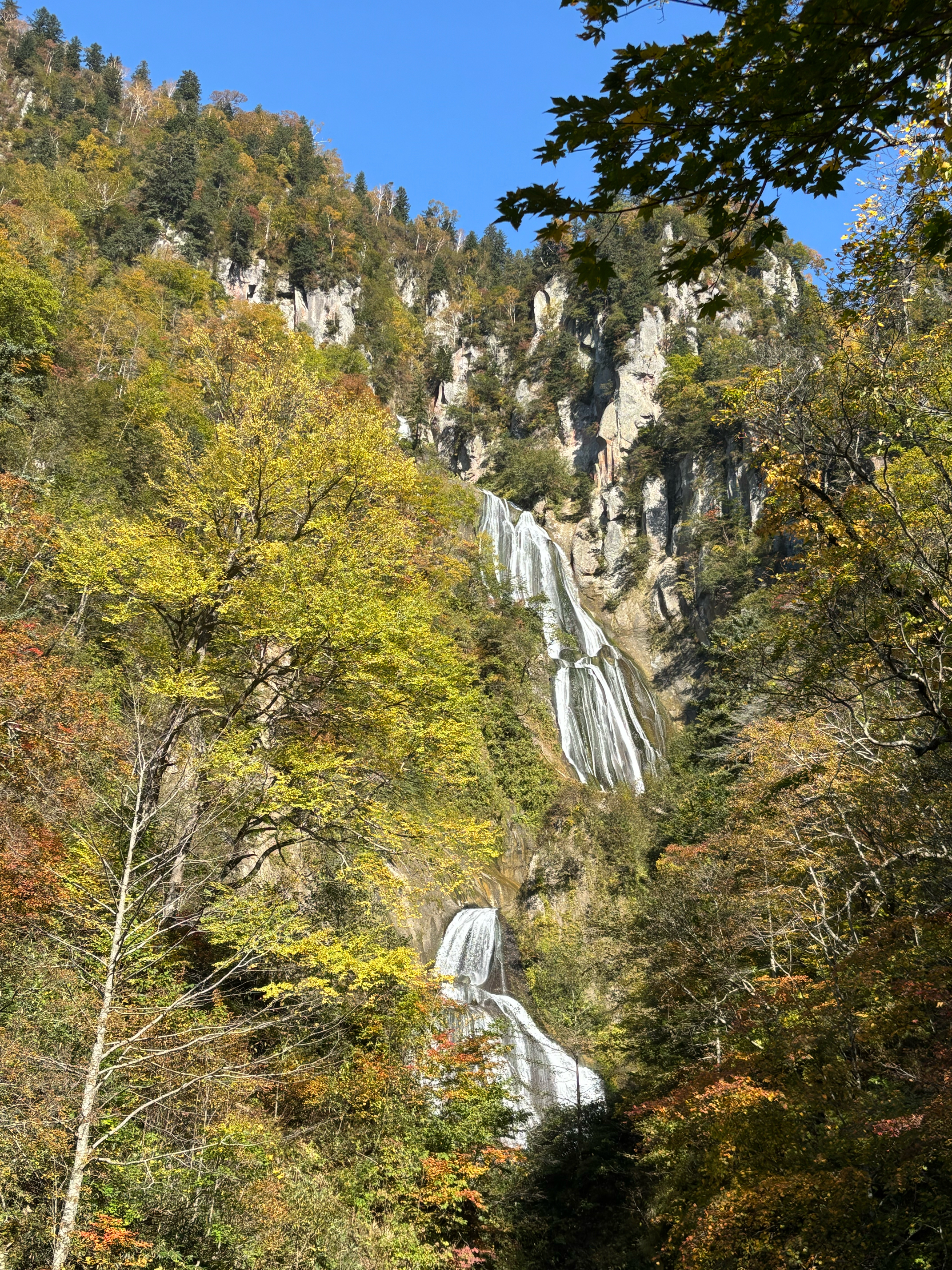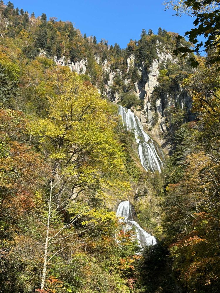 大雪山の東側・天人峡にかかる「羽衣の滝」は、「日本の滝百選」にも選ばれた名瀑。約270mと北海道で最も高い落差を誇り、日本でも屈指のスケールを誇ります。忠別川の支流・アイシポップ沢と双見沢からの清流が七段に折れ曲がりながら流れ落ち、滝の途中で合流する姿はまさに圧巻です