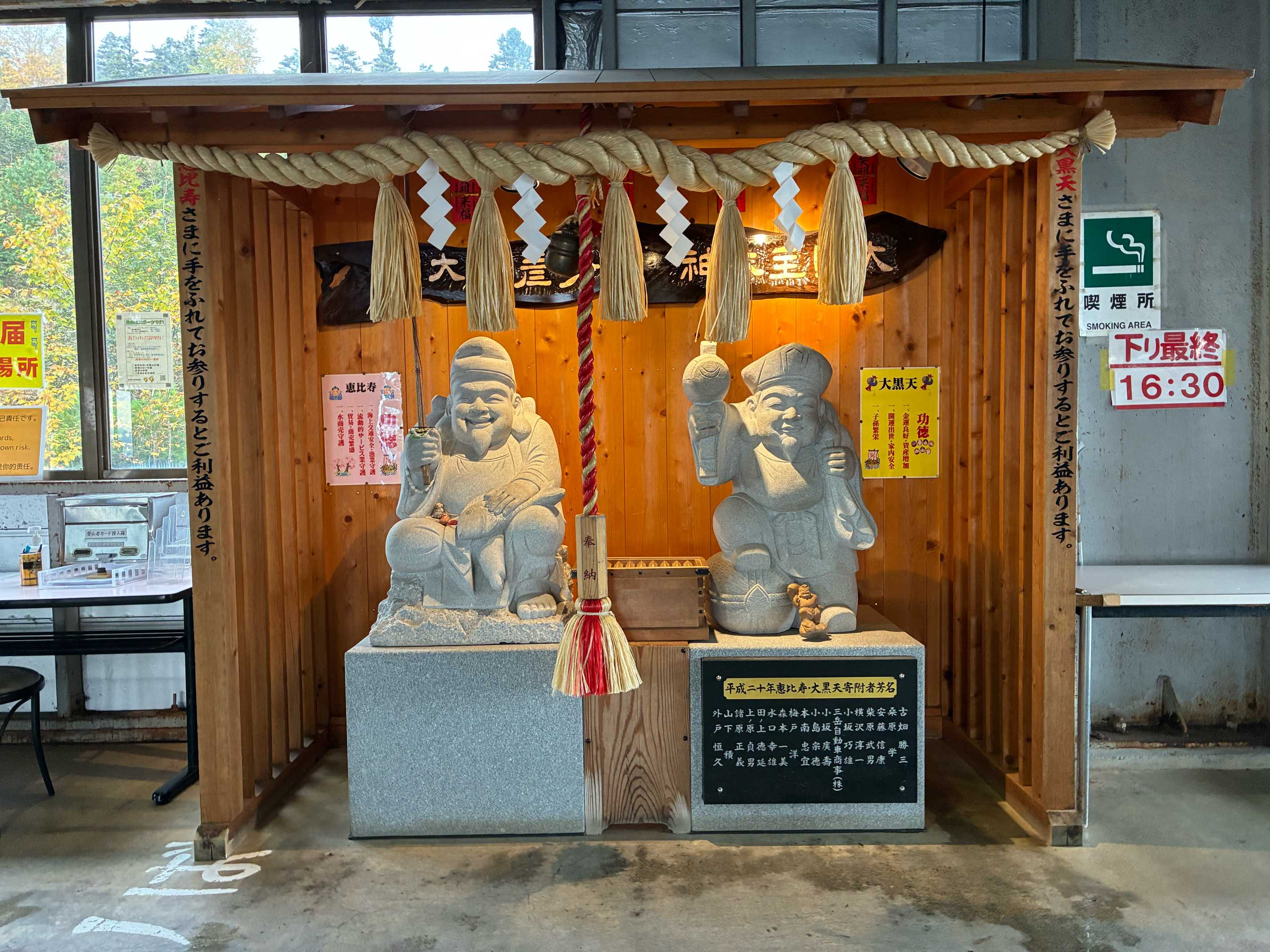 山頂駅では恵比寿さまと大黒天がお出迎え。「豊かな心になれますように🙏」