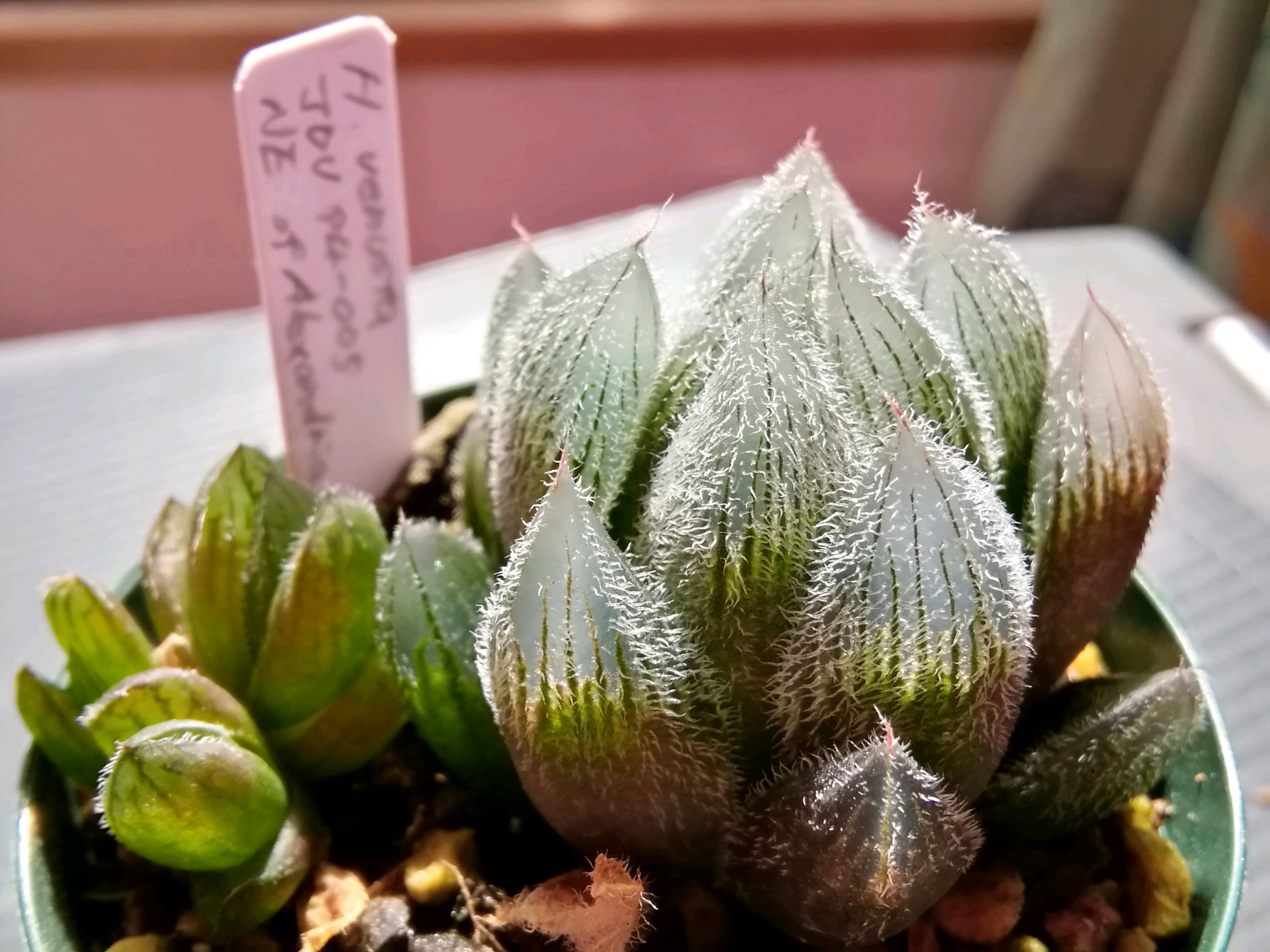 H. cooperi var venusta JDV 94-005 NE of Alexandria ナンバー、ロカリティ付きの原種。ベヌスタの中では割と縦に長く伸びる印象で毛の向こうの窓がわりとよく見える。横の小さな株は現状見た目は同じ種類かちょっと疑問ではあるけれど違う種類のものを植え込むことはないと自分を信じてそのまま送ります。大きくなって完全に他人だったら良きに計らってください